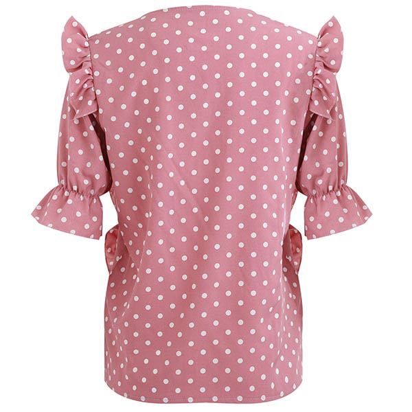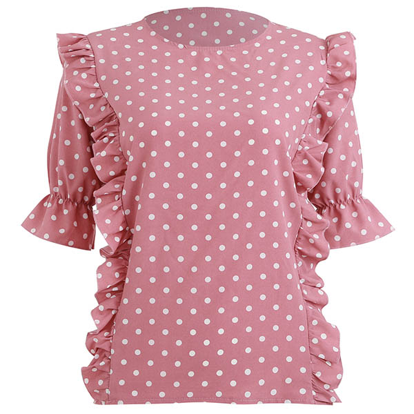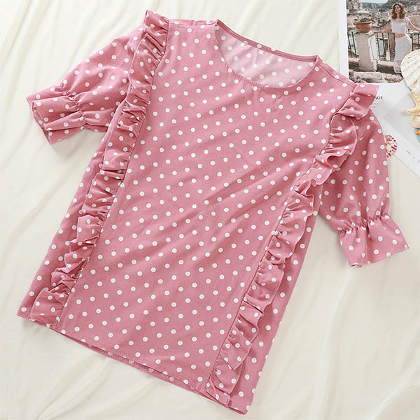 Sweet Style Short Sleeve Round Neck Dots Printed Ruffle Top
