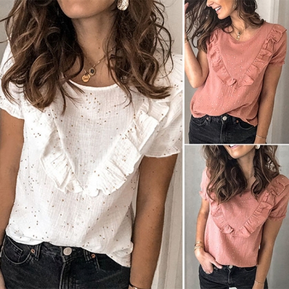 For a fresh and sweet daily style,you can have a try this wonderful top. It boasts a solid color,finished with short sleeve,round neck and ruffle details,this piece not only can give you a comfortable day,but also can offer offer you many matching opportunities. So why not take interest in it to update your style?
