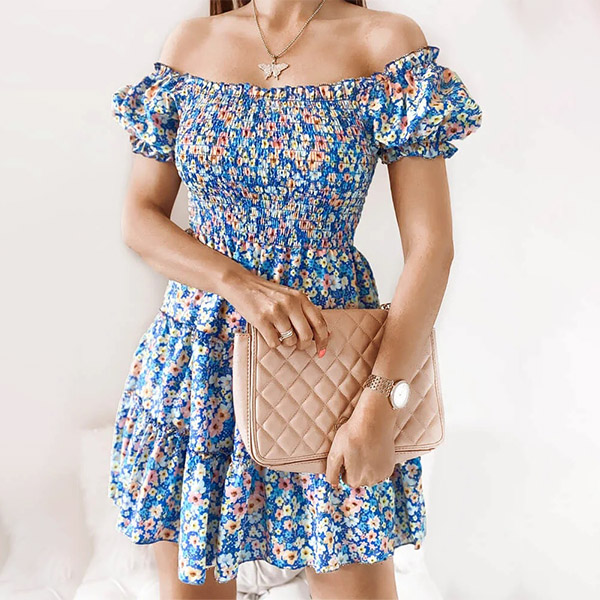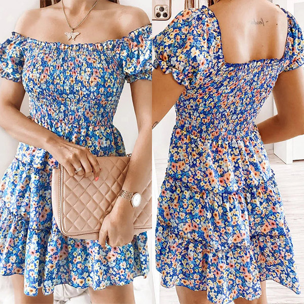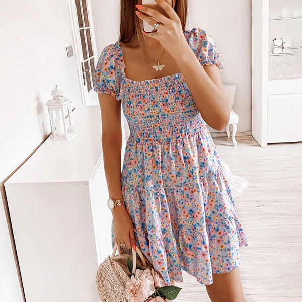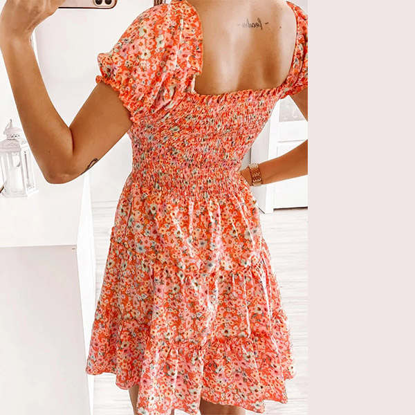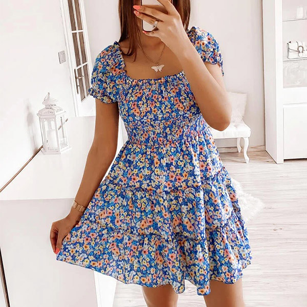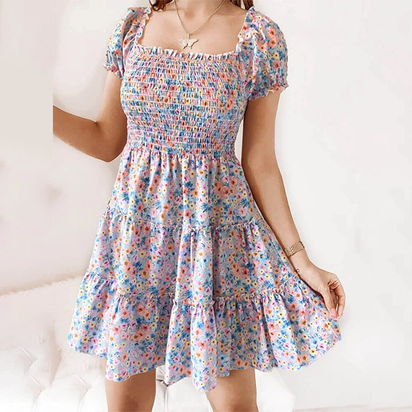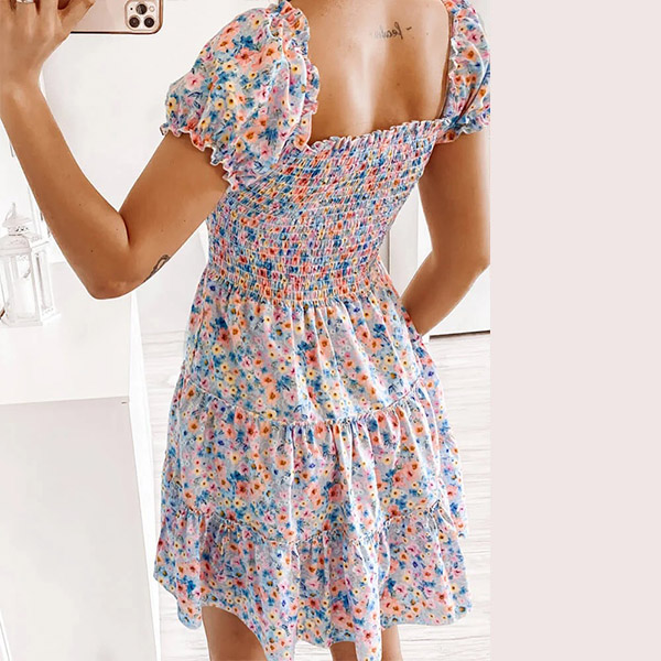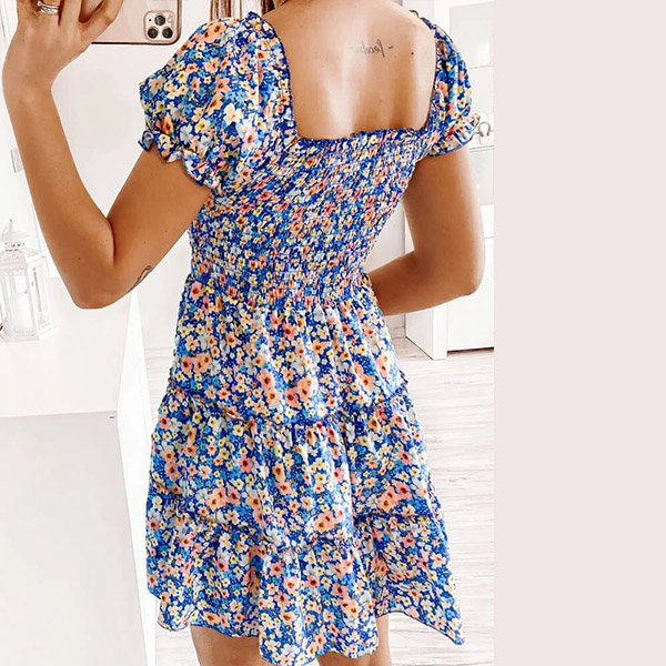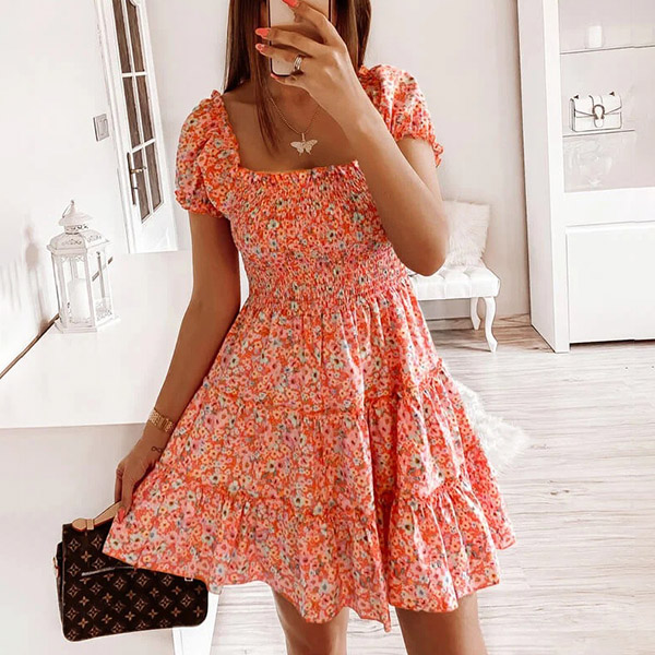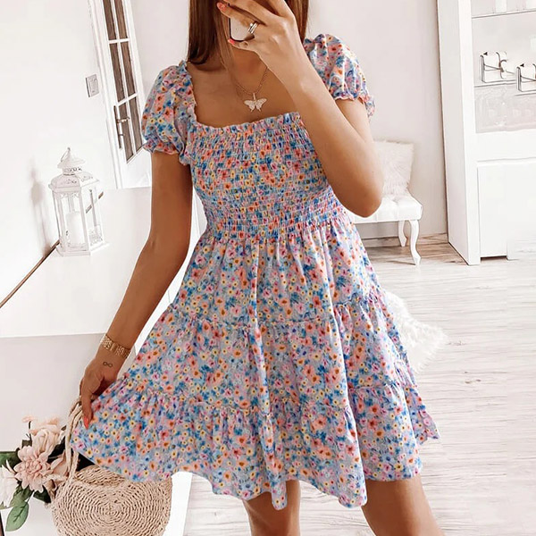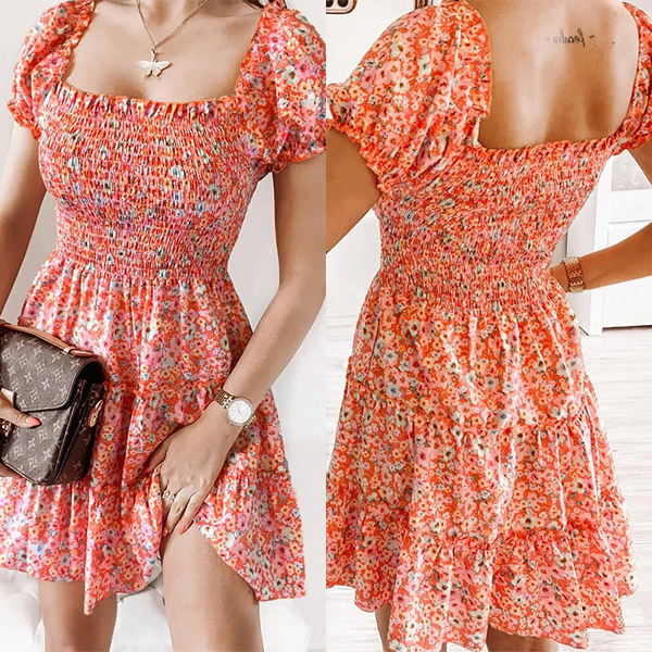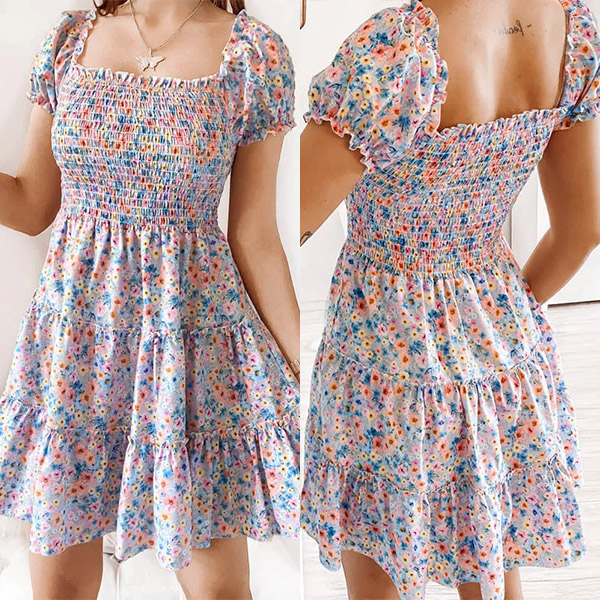 When it comes to a sweet yet stylish summer look,this printed dress can easily strike your mind. The vibrant floral print details can help you catch more eyes. Finished with short sleeve,square collar and high waist design,this dress not only can exude your feminine appeal,but also can showcase your slender figure.