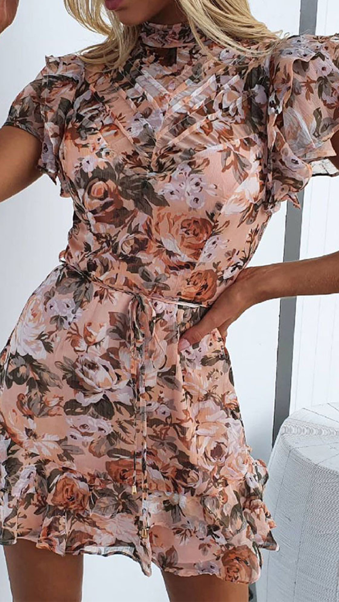 No matter for your daytime out to night dating,this beautiful dress can give you an easy transition. Its vibrant floral print details will help you catch more eyes. Finished with short sleeve,stand collar and ruffle hem design,this dress knows how to exude your sweet yet feminine side. Just update your wardrobe with this wonderful piece.