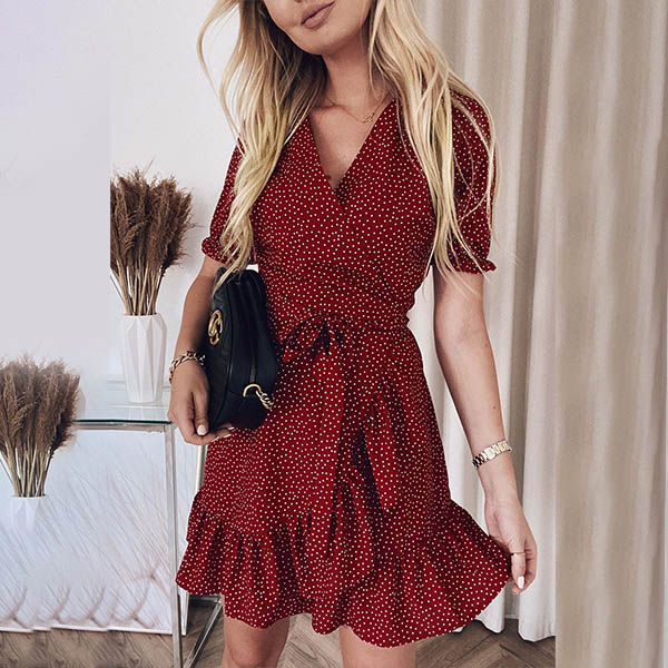 Any girl can look effortlessly charming and beautiful in this dress. Features chic printed printed details,with short sleeve,v-neck and an irregular ruffle hem design,this dress can lend you a dash of sweet and flirty vibes. No matter for your daily out and night dating,this dress can be a good choice.