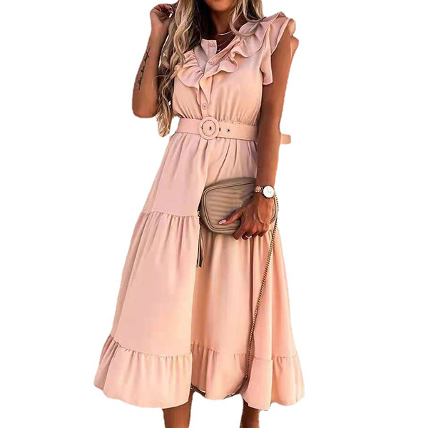 Sweet Style Sleeveless V-neck Solid Color Ruffle Dress with Waistband