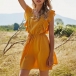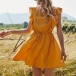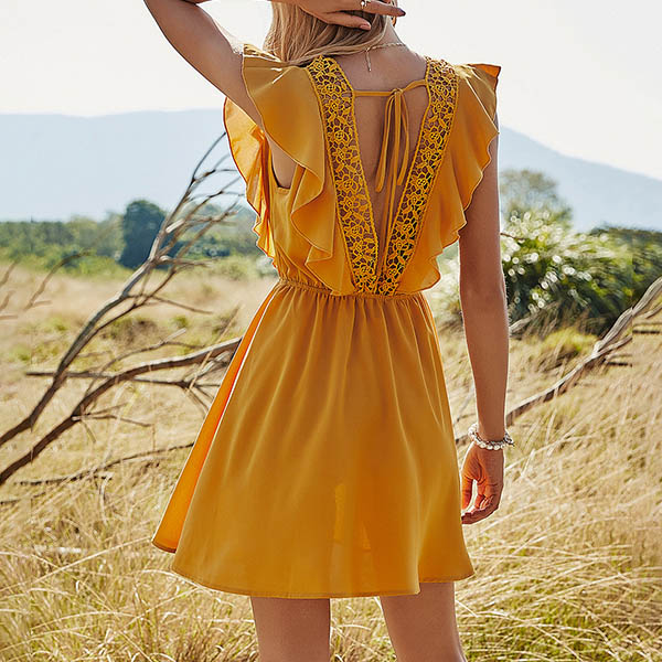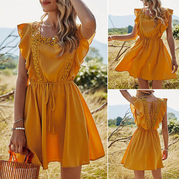 As one of the summer essentials,this dress is worth to arouse your attention. Solid color tone design makes it look simple yet generous. What's more,the ruffle,square collar and lace spliced details will enhance your feminine appeal. For your summer days,this dress can be your wise choice.