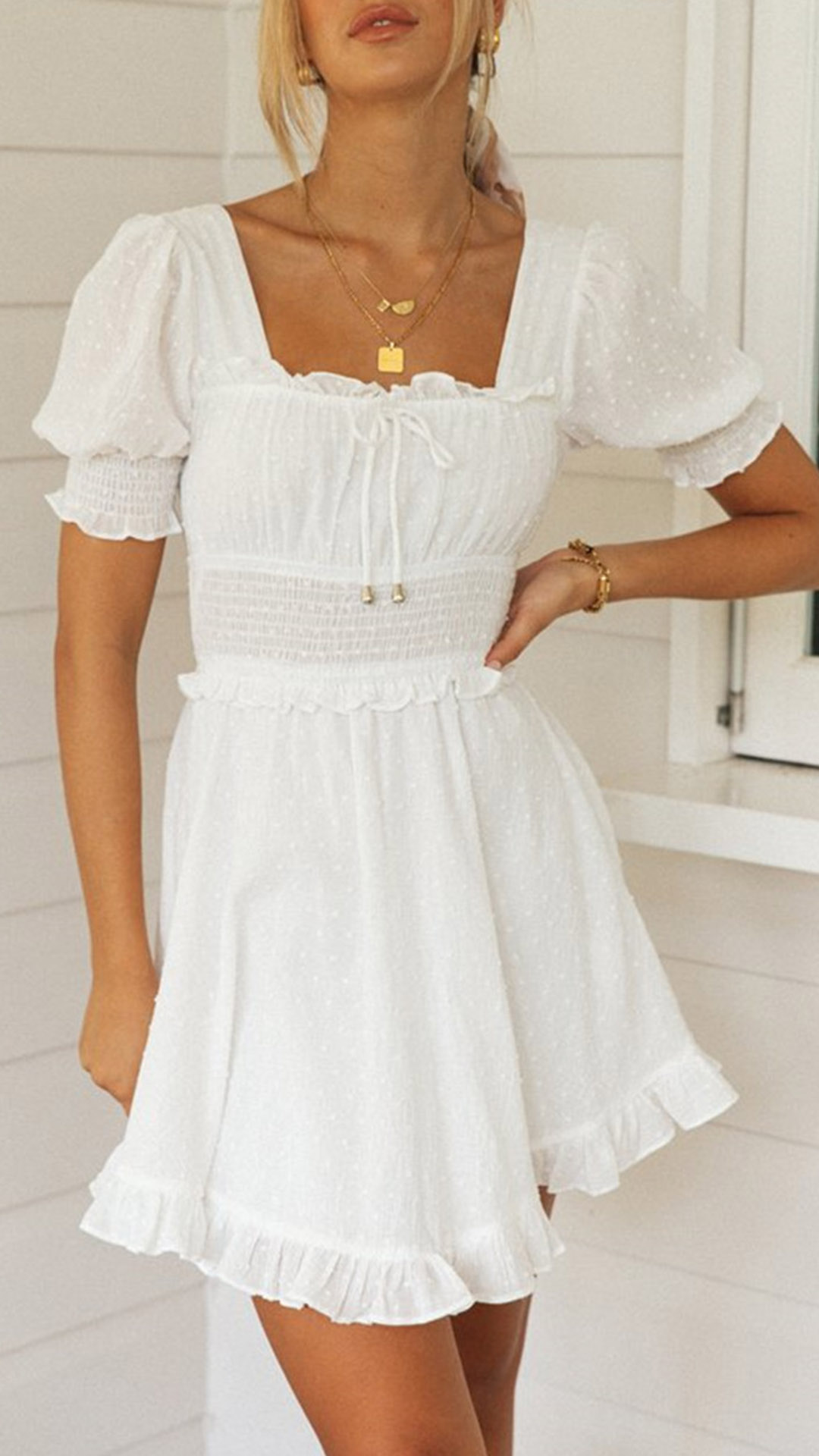 This Sweet Style Swiss-dot Dress is the perfect choice for a summer day. The lightweight material is soft and comfortable, making it ideal for warm days. The Swiss-dot pattern gives the dress a unique and stylish look, while the short sleeves and ruffle detail along the wasit and hemline add a touch of femininity. Wanna have a try?