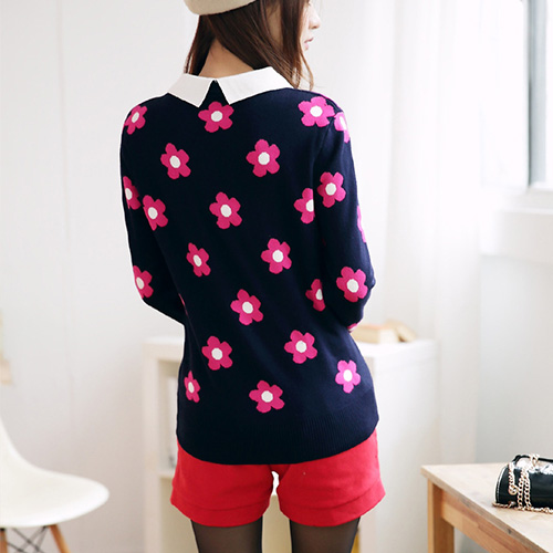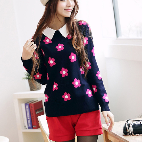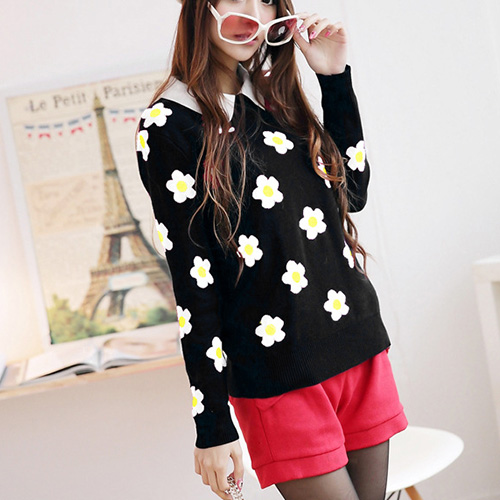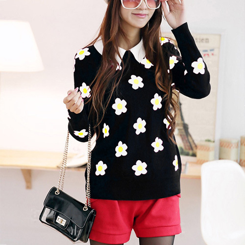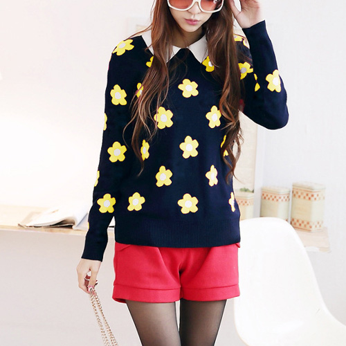 Show your sweet and fresh sense through this knitting sweater. It features sun flower pattern,enthusiasm and fashion and bring you good mood. Long sleeve and POLO collar design. If pair with floral print skirts,you would be more elegant and sweet.