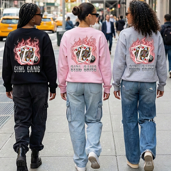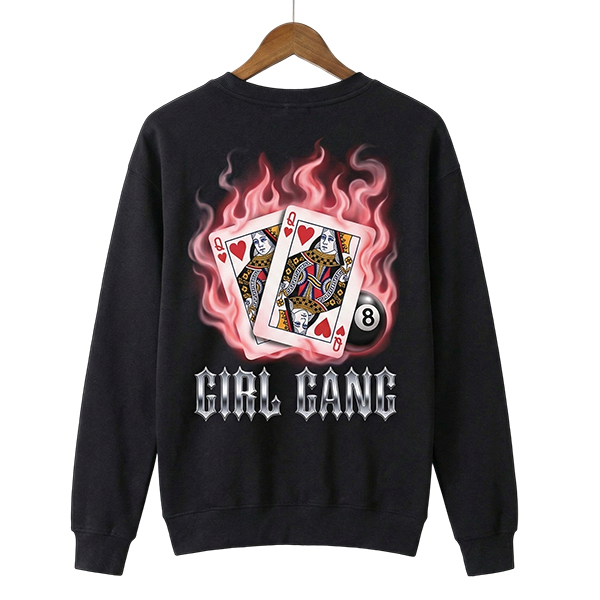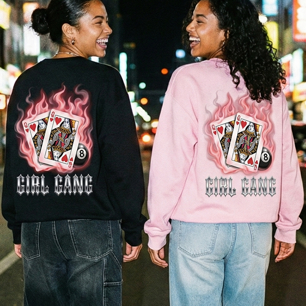 Featuring a vintage graphic on the back, this design showcases twin "Queen of Hearts" playing cards engulfed in soft flames and smoke, grounded by a classic 8-ball and polished chrome typography. It’s not just a sweatshirt; it’s a statement that you and your besties are the winning hand.