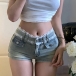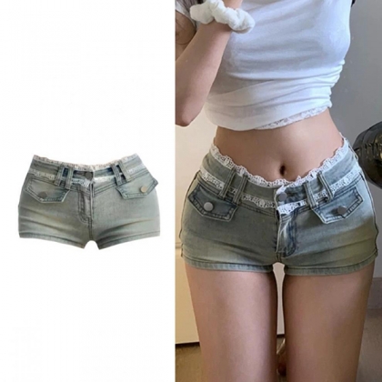 Tight Fit Denim Shorts featuring Low Waist and Lace Stitching Details
