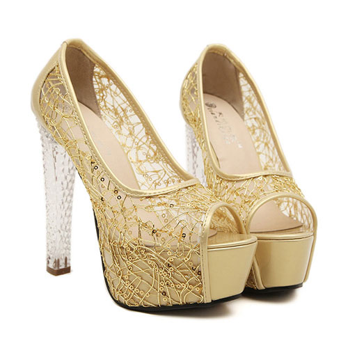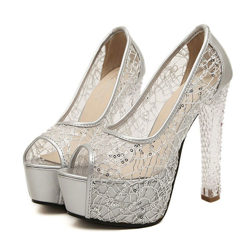 Featuring an open toe and sheer mesh upper set with sequins,the sexy piece is a must have for your clubwear.It features a gold or silver colorway,5.31" clear block heel and 1.77" platform. Style it with flattering dress.