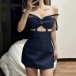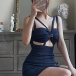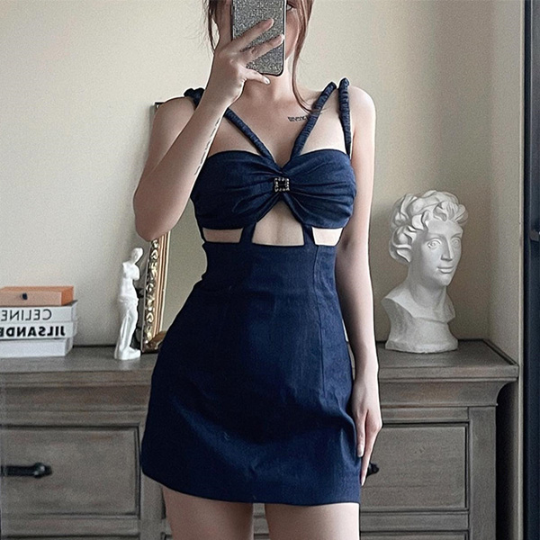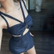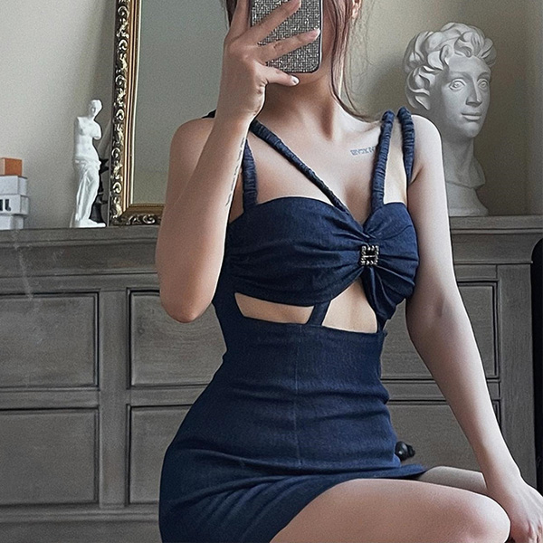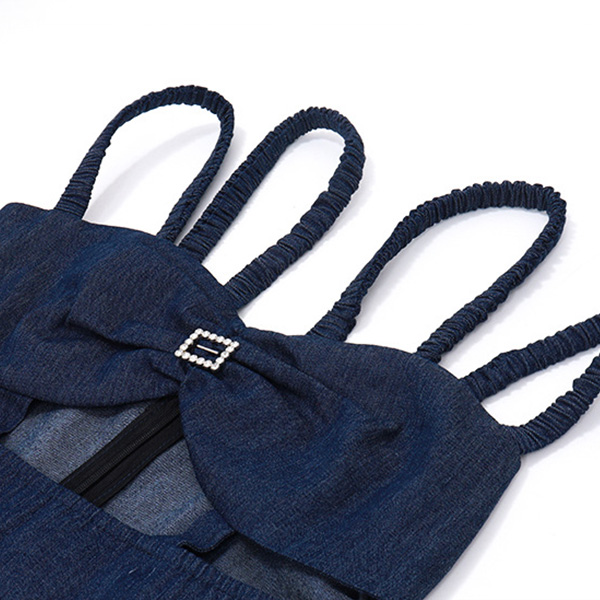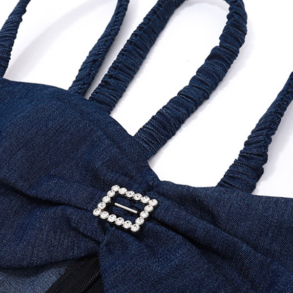 Trendy Denim Halter Sling Dress with Shoulder Straps and Wrapped Neckline