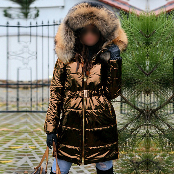 Trendy Mid-Length Cotton-Padded Coat with Waist Tie and Large Faux Fur Collar Hooded