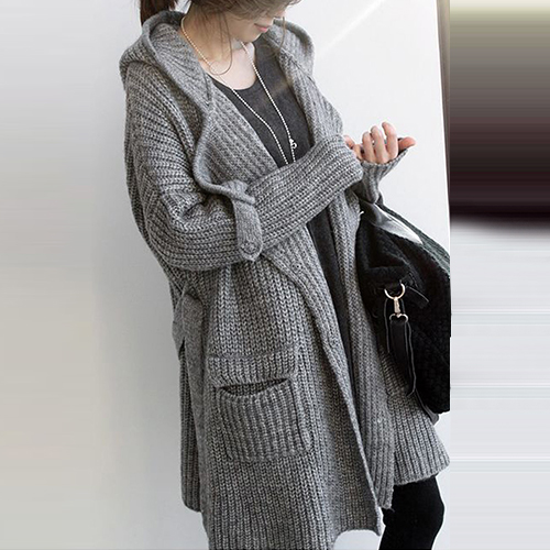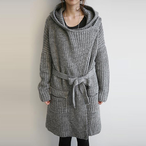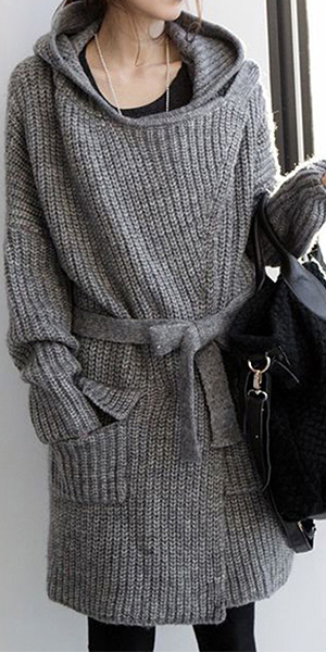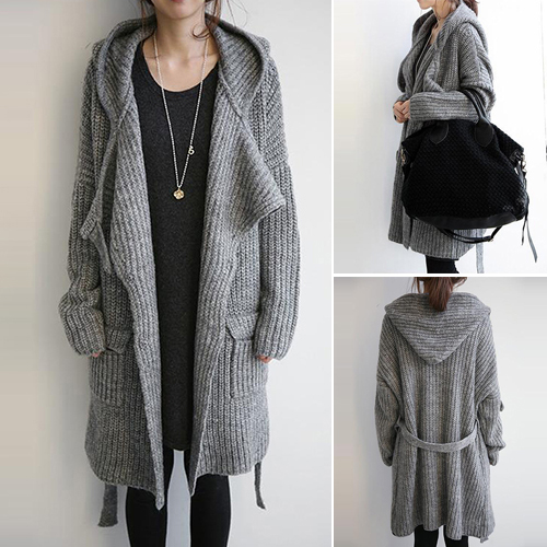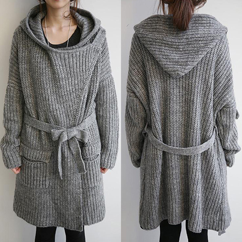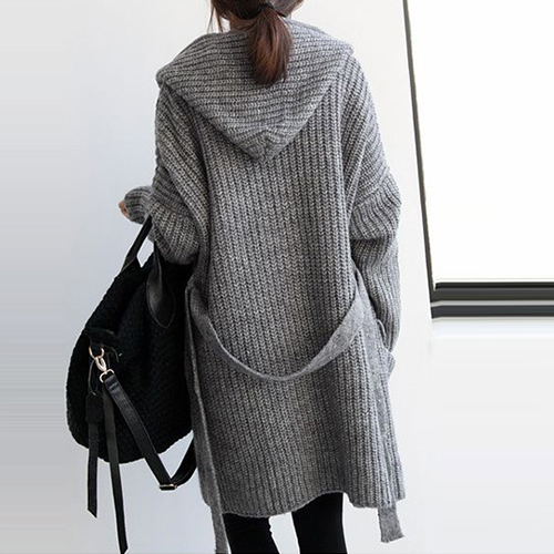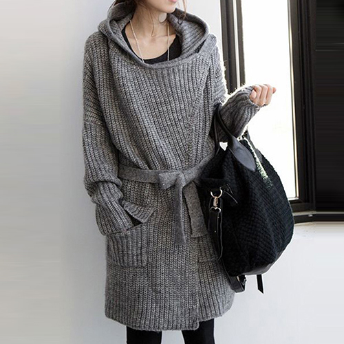 Trendy Solid Color Long Sleeve Hooded Knit Cardigan with Waist Strap