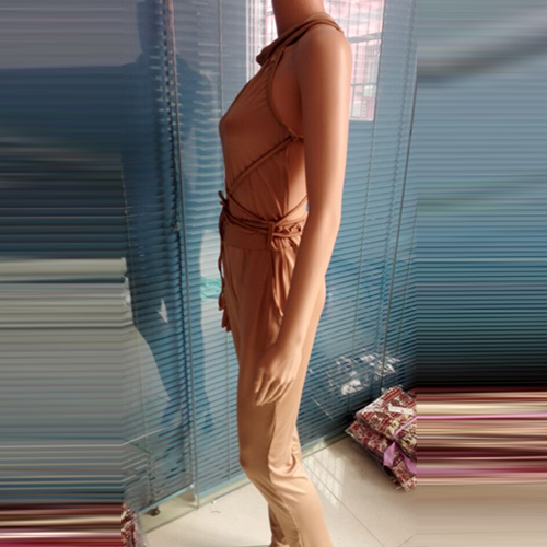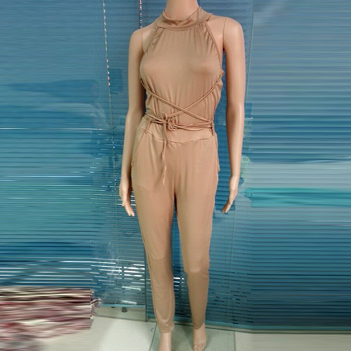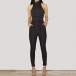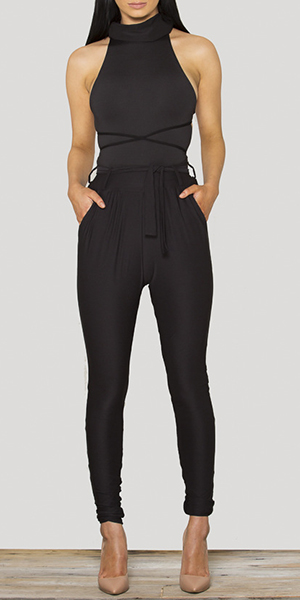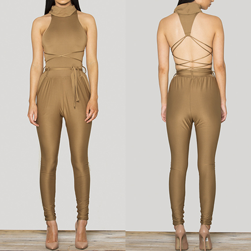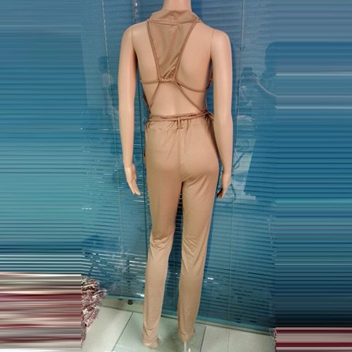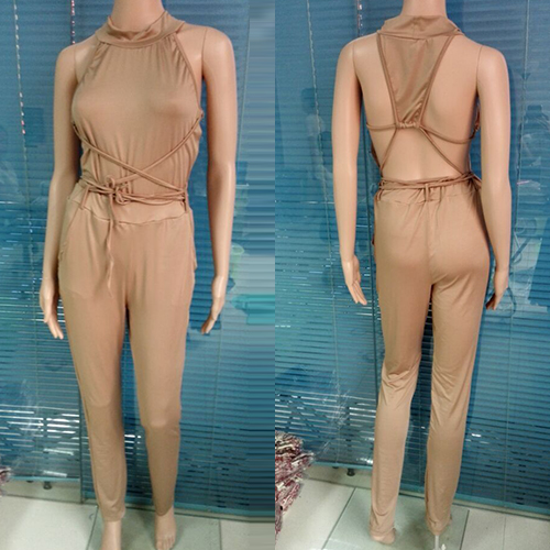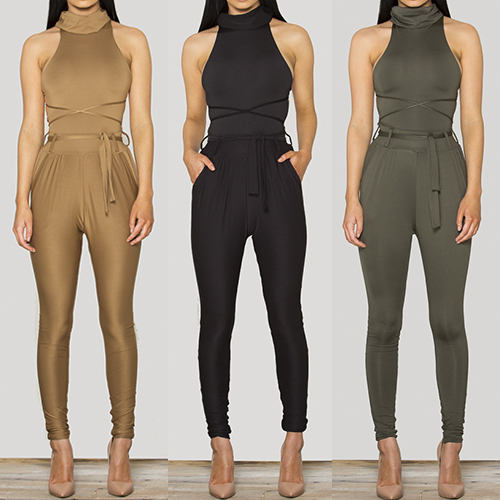 You would be attracted by this jumpsuit due to its unique design, such as solid color, sleeveless
