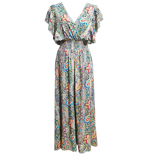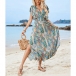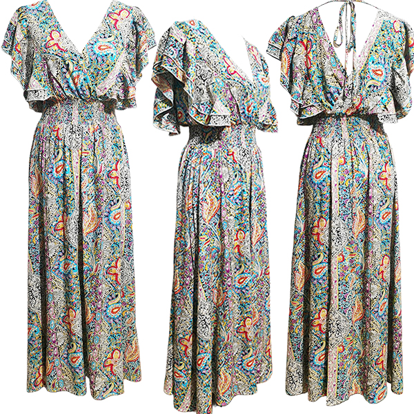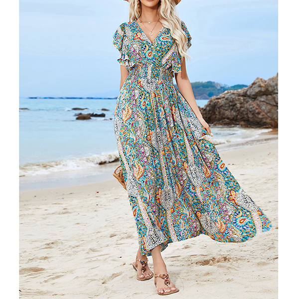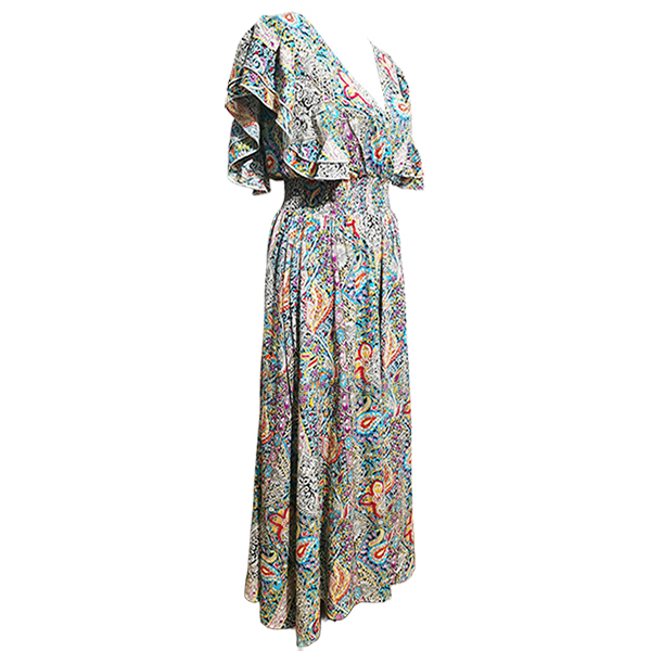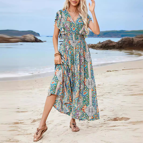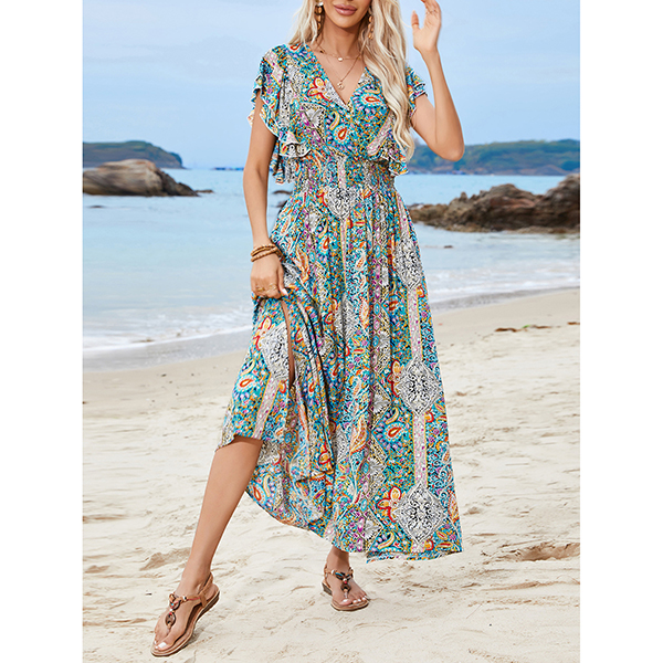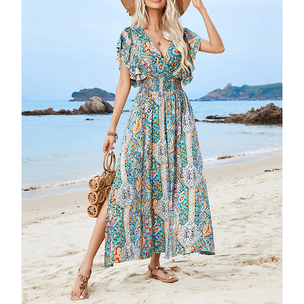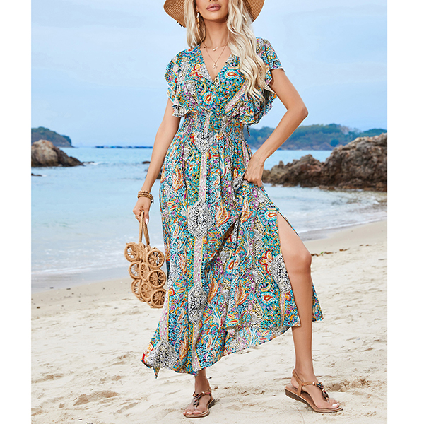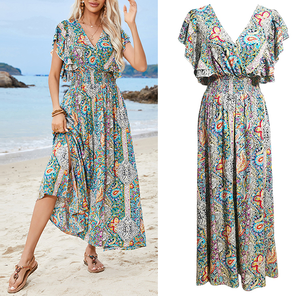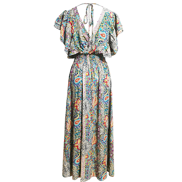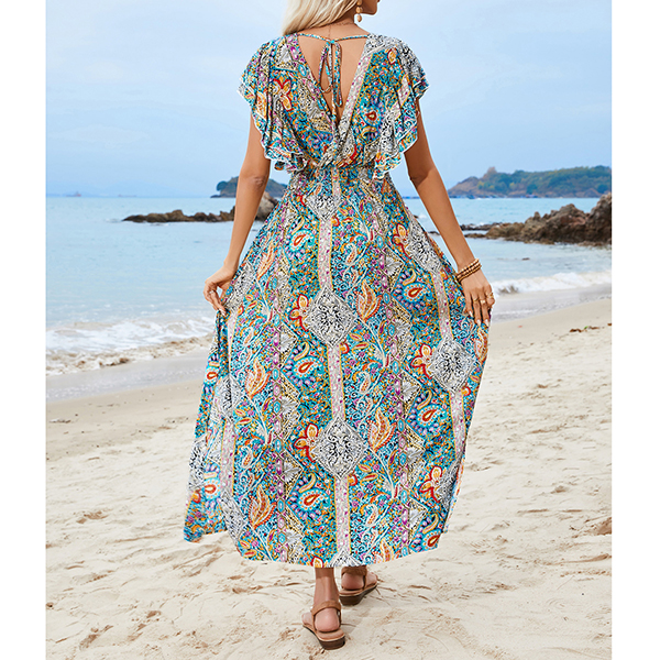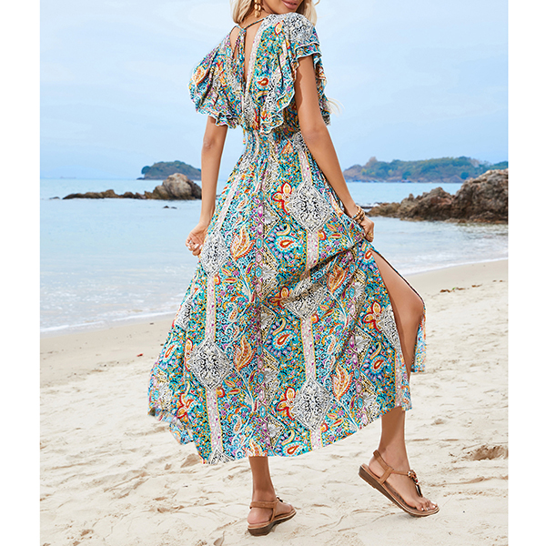 V-Neck Backless Rayon Dress with Prints Ruffled Sleeves and Slit Design