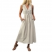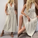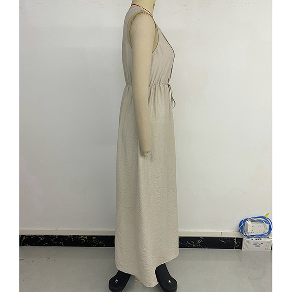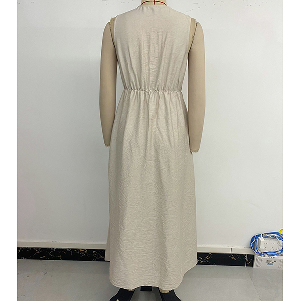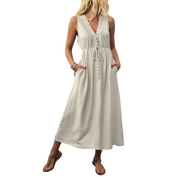 Casual Button V-neck Sleeveless Drawstring Waist Side Pockets Midi Dress