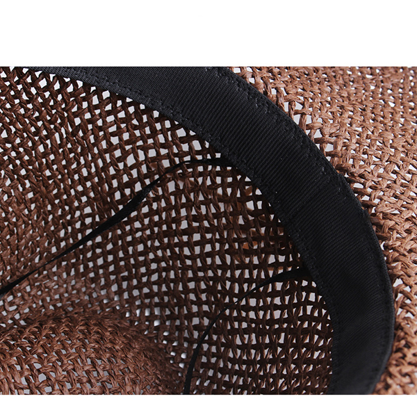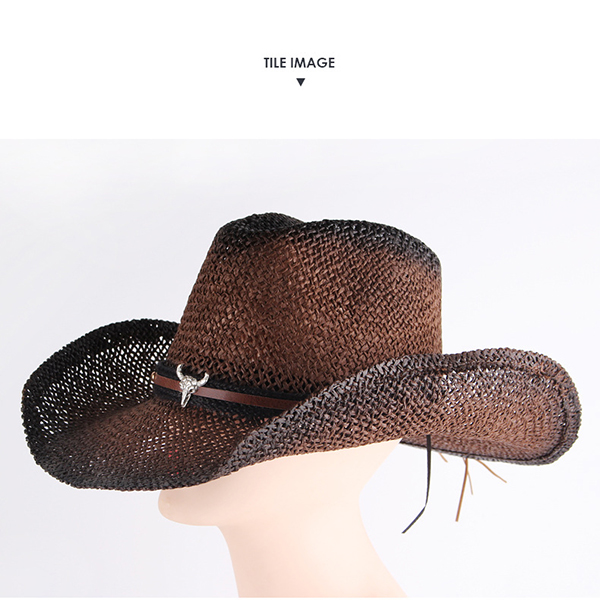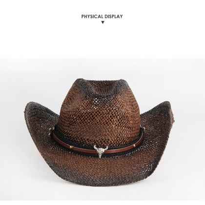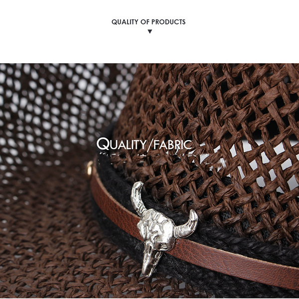 Vintage Braided Straw Cowboy Hat with Bull Headband Breathable Western Sun Hat