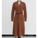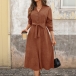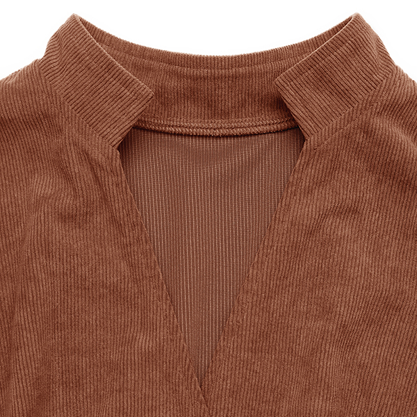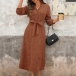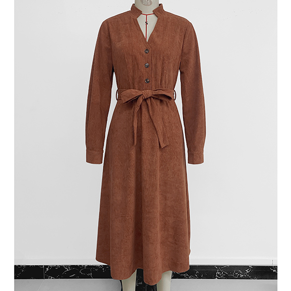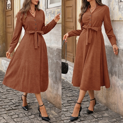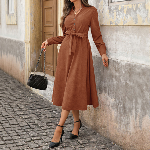 Vintage Button V-neck Long Sleeve Self-tie Corduroy Midi Dress