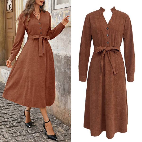 This Corduroy Midi Dress is a charming and nostalgic piece that combines retro style with modern trends. The self-tie waist detail cinches the waist and adds definition to the dress, creating a flattering and feminine silhouette. The corduroy fabric offers a textured and cozy feel, adding depth and visual interest to the outfit. Wanna have a try?