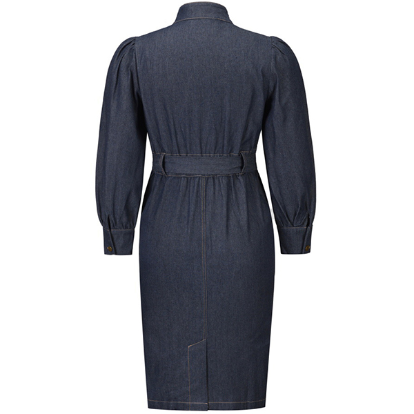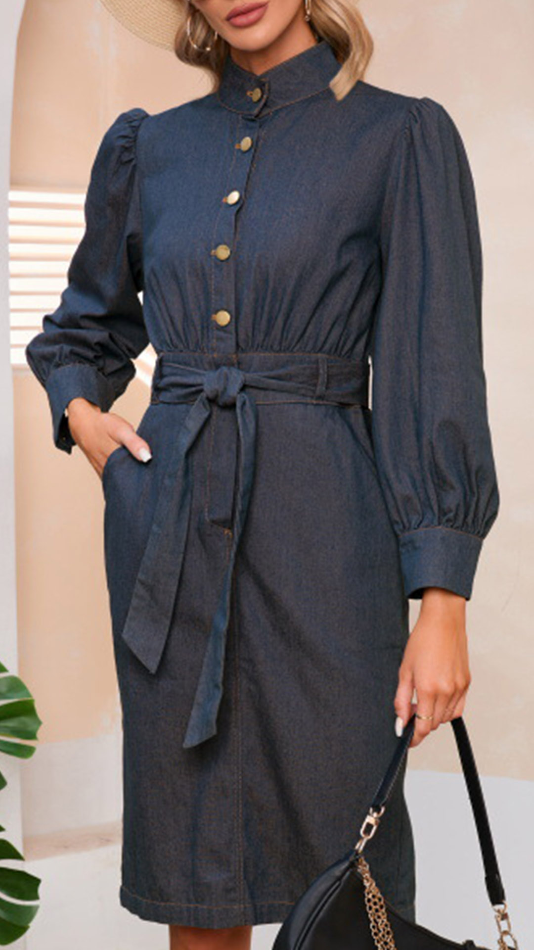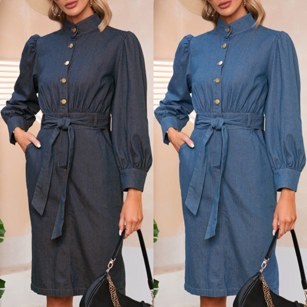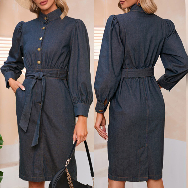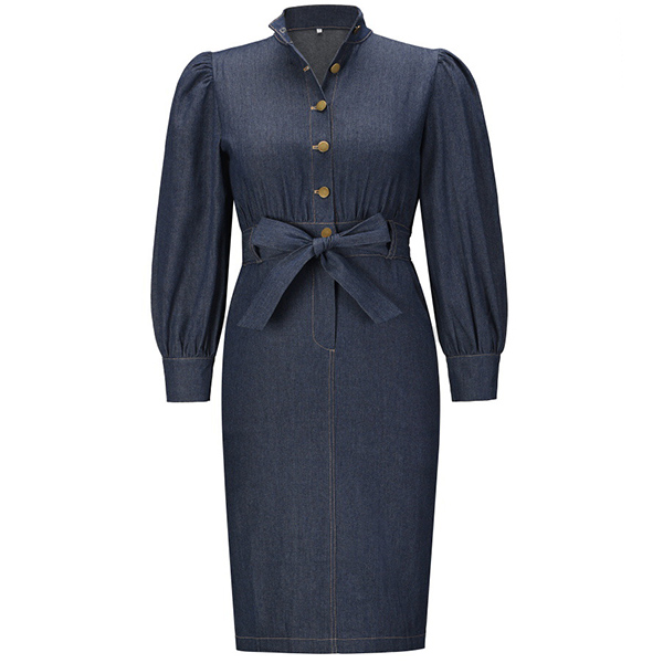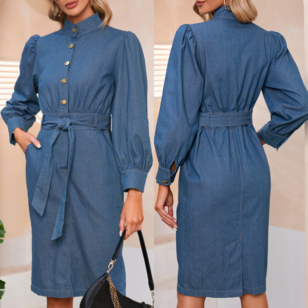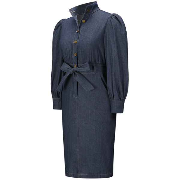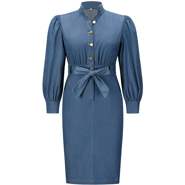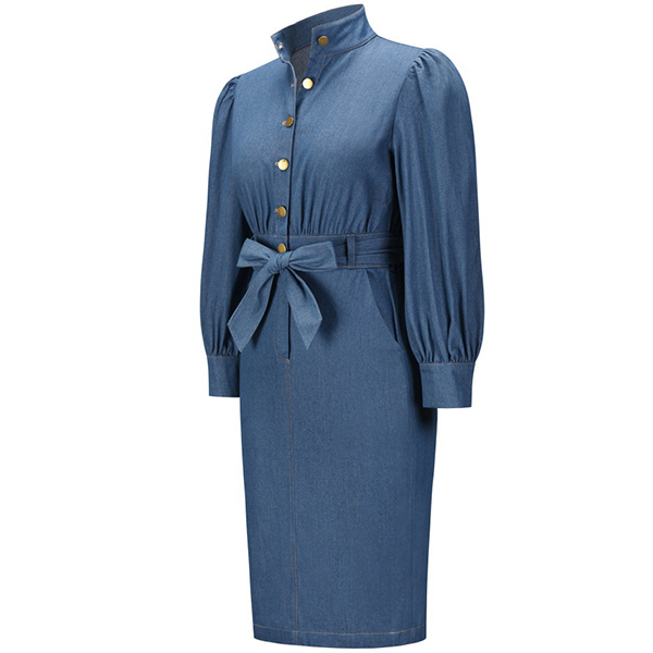 Vintage Buttoned Mock Neck Long Sleeve Self-tie Denim Dress