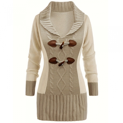 This vintage-inspired knitted shirt features a cable knit pattern, lapel V-neckline, long sleeves, and horn button decoration detailing, creating a classic and sophisticated look. Pair it with trousers or jeans for a casual yet polished look!
