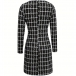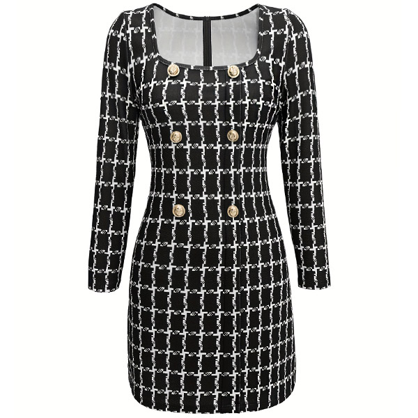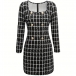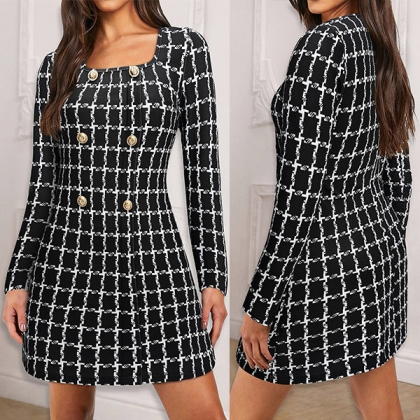 Vintage Checkered Square Neck Long Sleeve Double-breasted Mini Dress