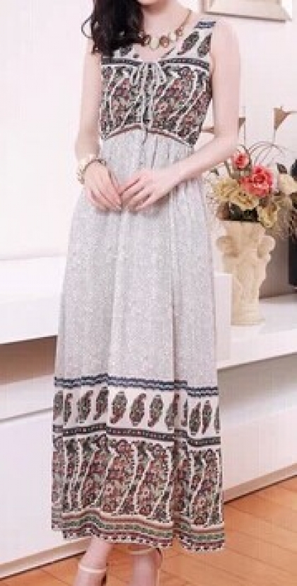 Vintage Chiffon Printed V-Neck Sleeveless Ankle-Length Dress For Women