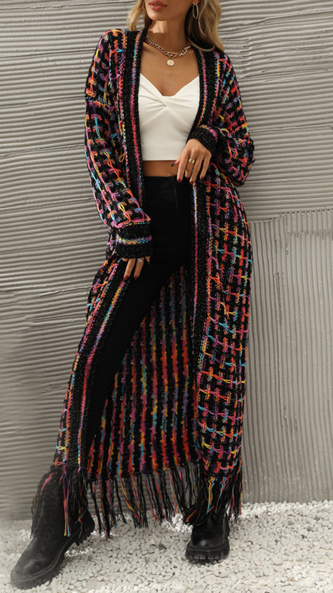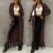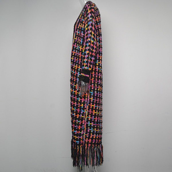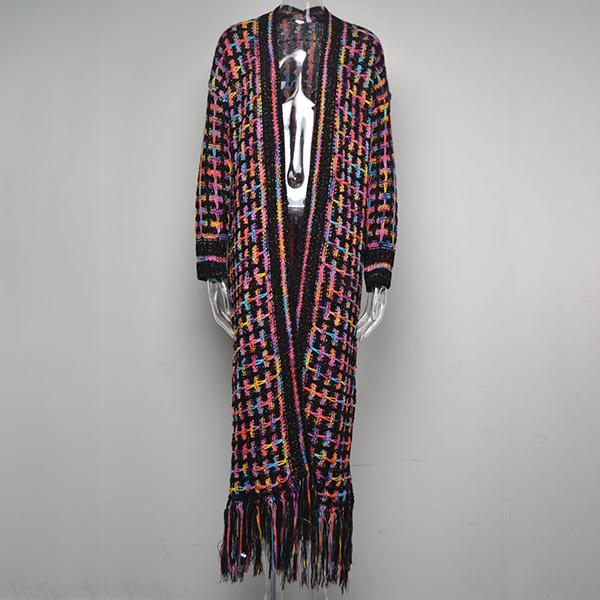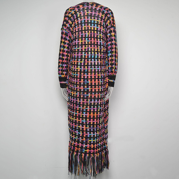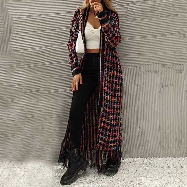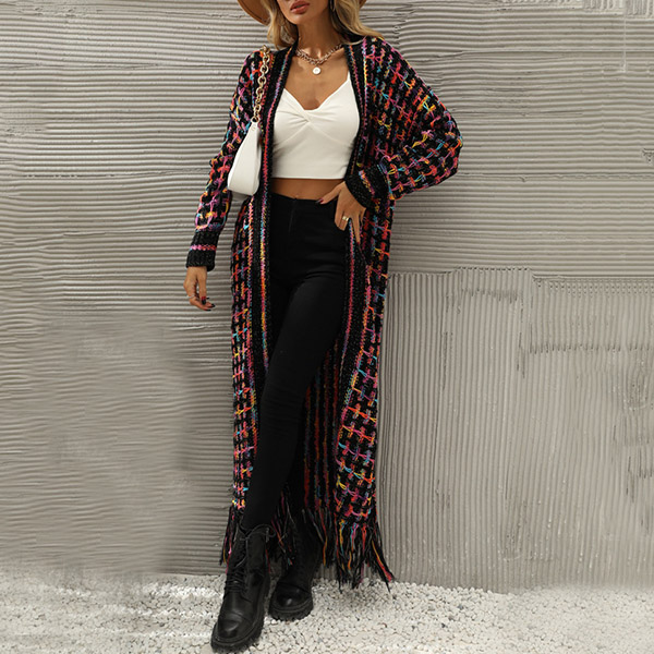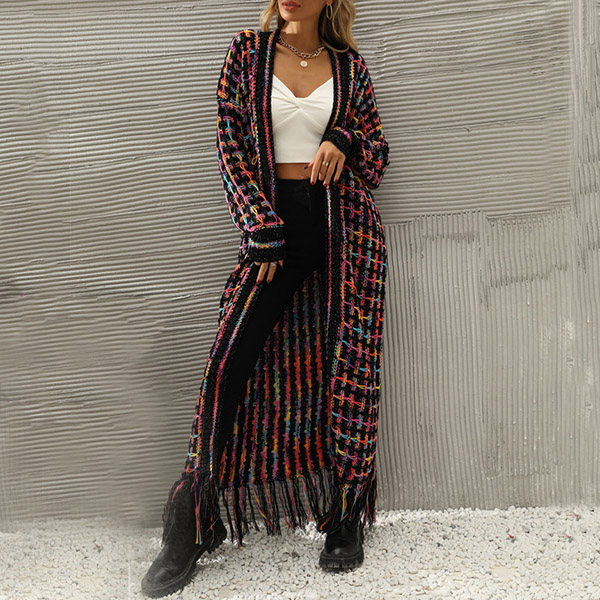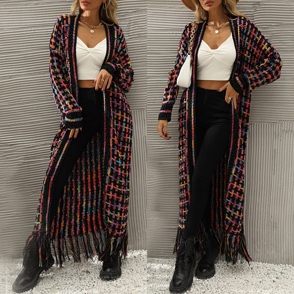 Vintage Contrast Color Long Sleeve Tassel Longline Knitted Cardigan