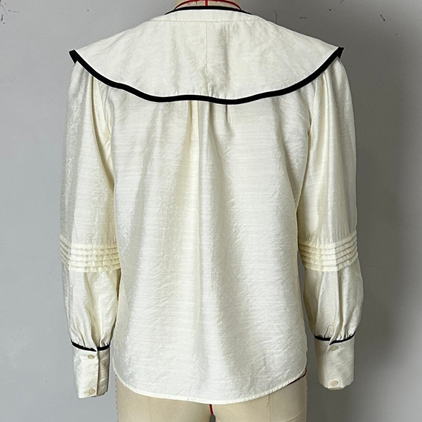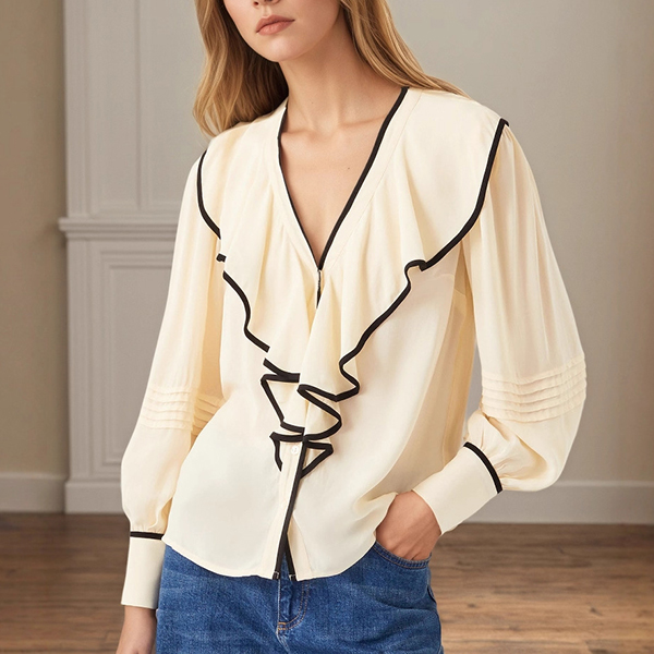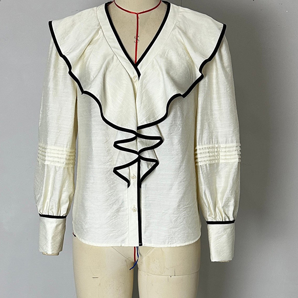 Step into timeless charm with this beautifully crafted shirt that captures the romance and elegance of vintage fashion while maintaining contemporary wearability. The contrast color detailing creates striking visual interest and adds depth to the design. The ruffle lapel is the defining feature that sets this shirt apart, adding feminine softness and vintage-inspired romance to the classic button-down silhouette. This shirt works beautifully tucked into high-waisted trousers or skirts for a polished vintage look, or worn loose over fitted bottoms for relaxed sophistication.