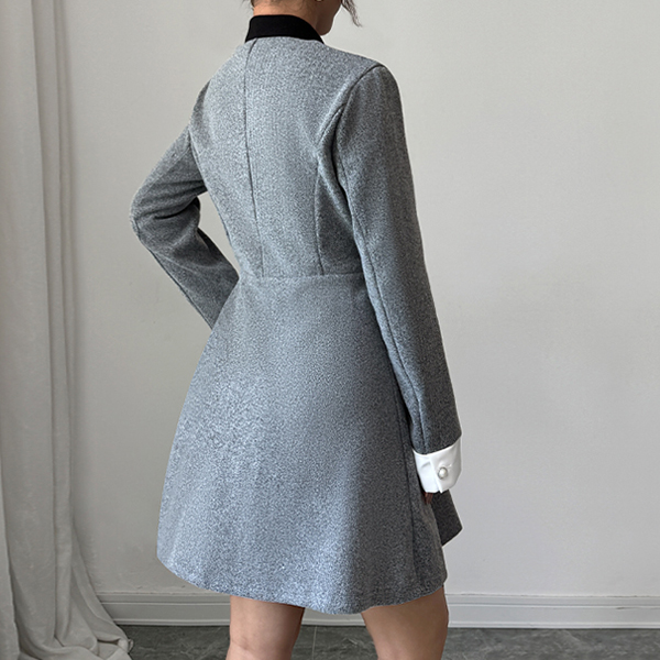 This mini dress features contrast color along the neckline and cuff. The front button adds functional detail with modern industrial appeal, creating visual interest down the dress's center line. Perfect for daily wear.