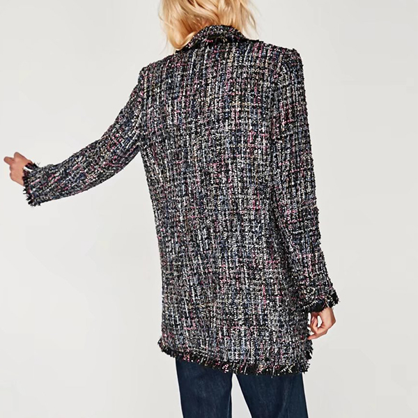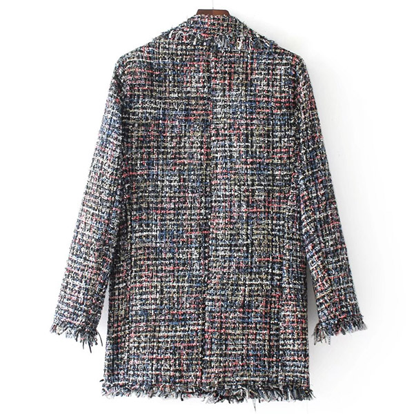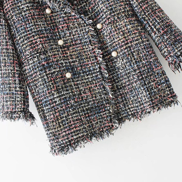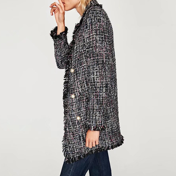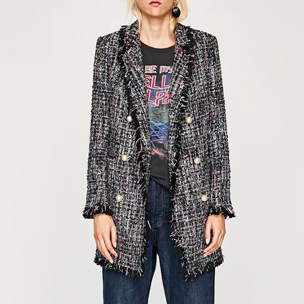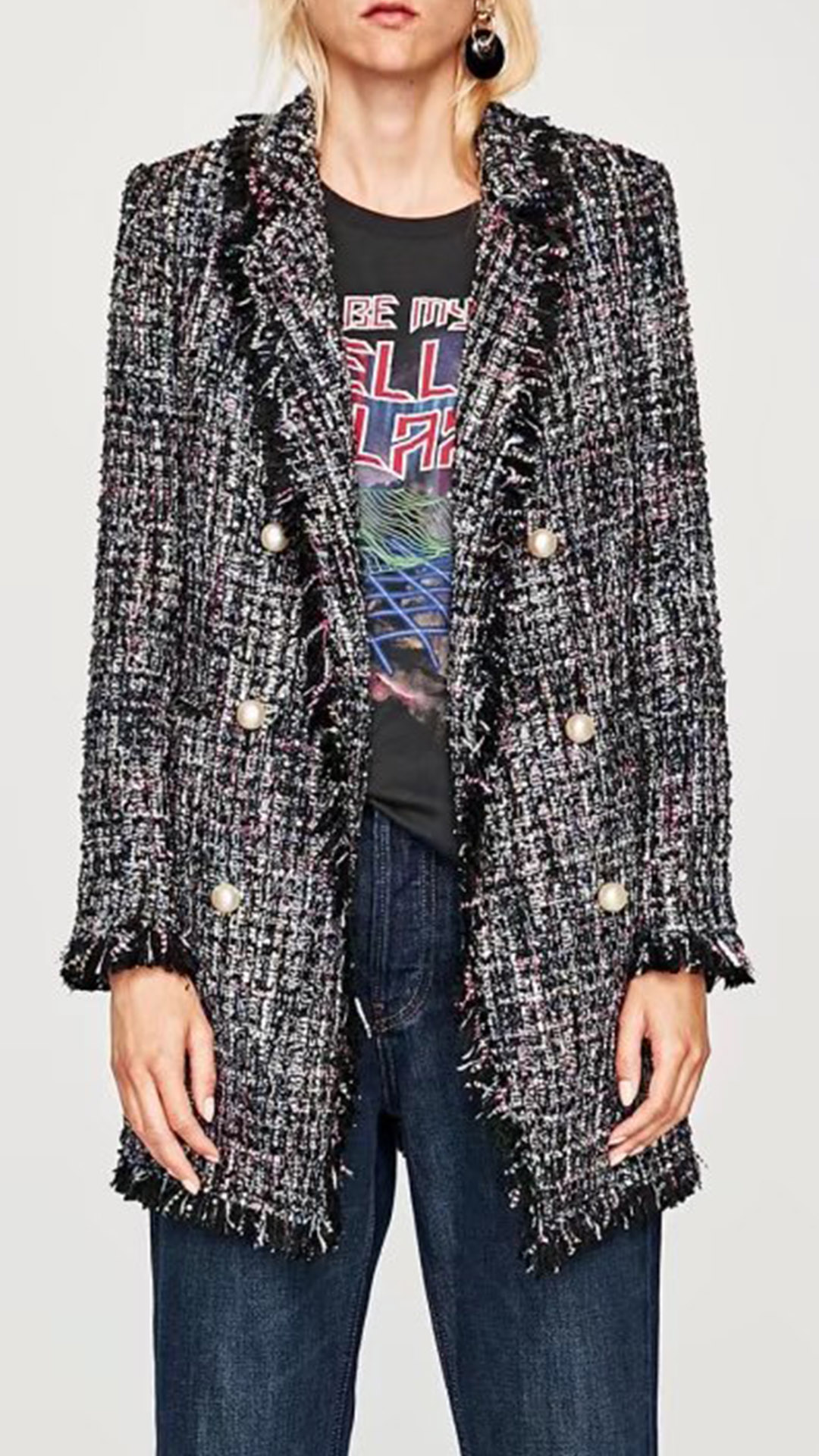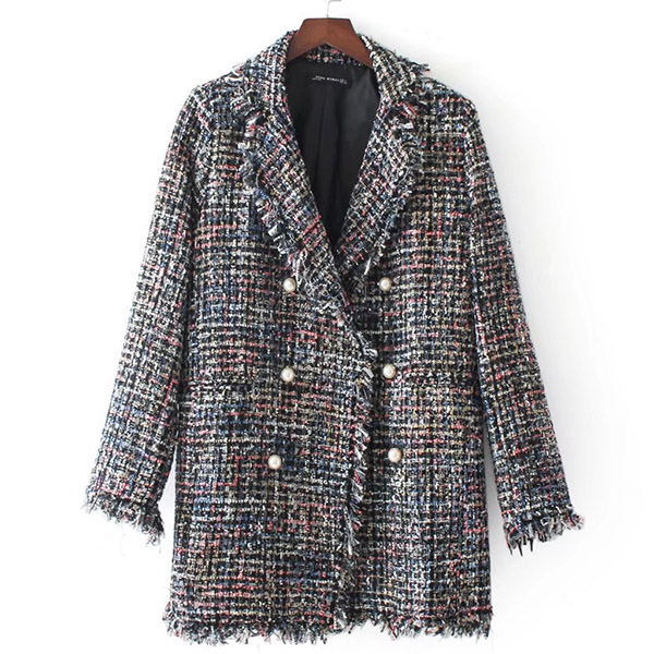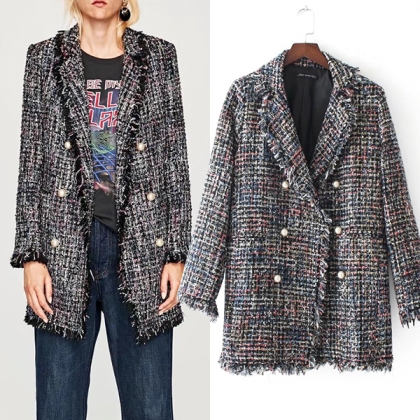 Crafted with high-quality fabric, this jacket offers a comfortable and flattering fit. The double-breasted design adds a classic and sophisticated element, giving the jacket a polished and refined look. The frayed hemline adds a unique and vintage-inspired detail to the jacket. Wanna have a try?