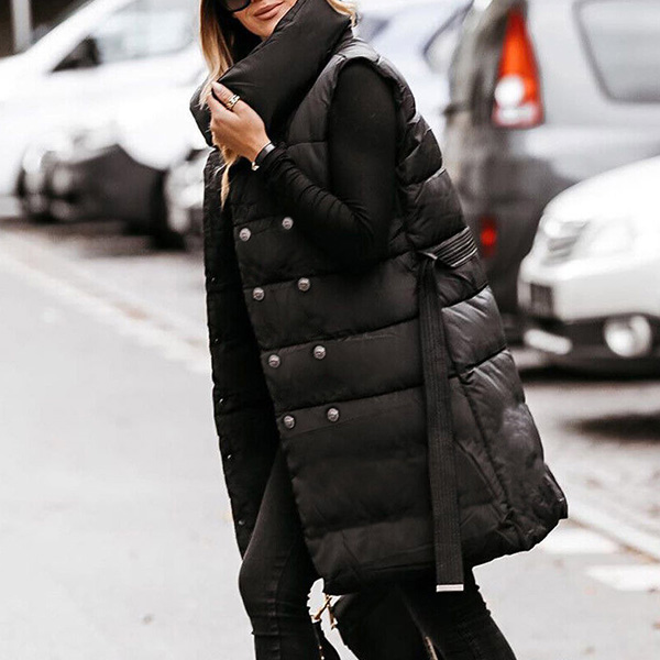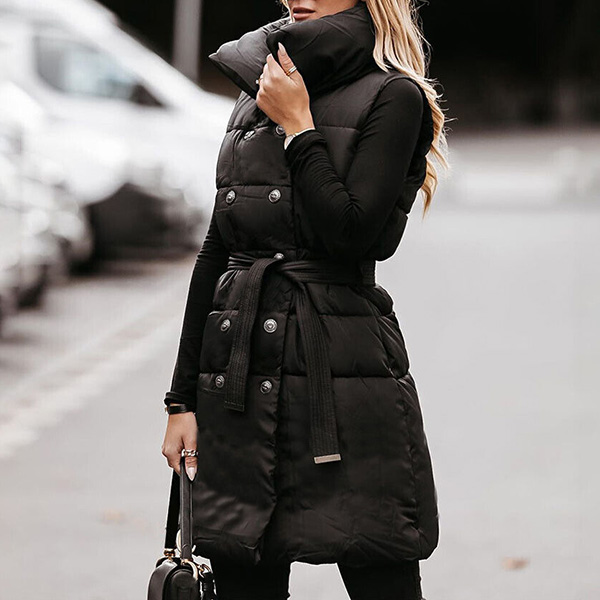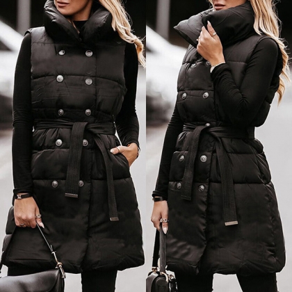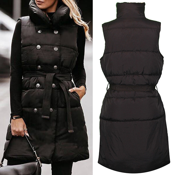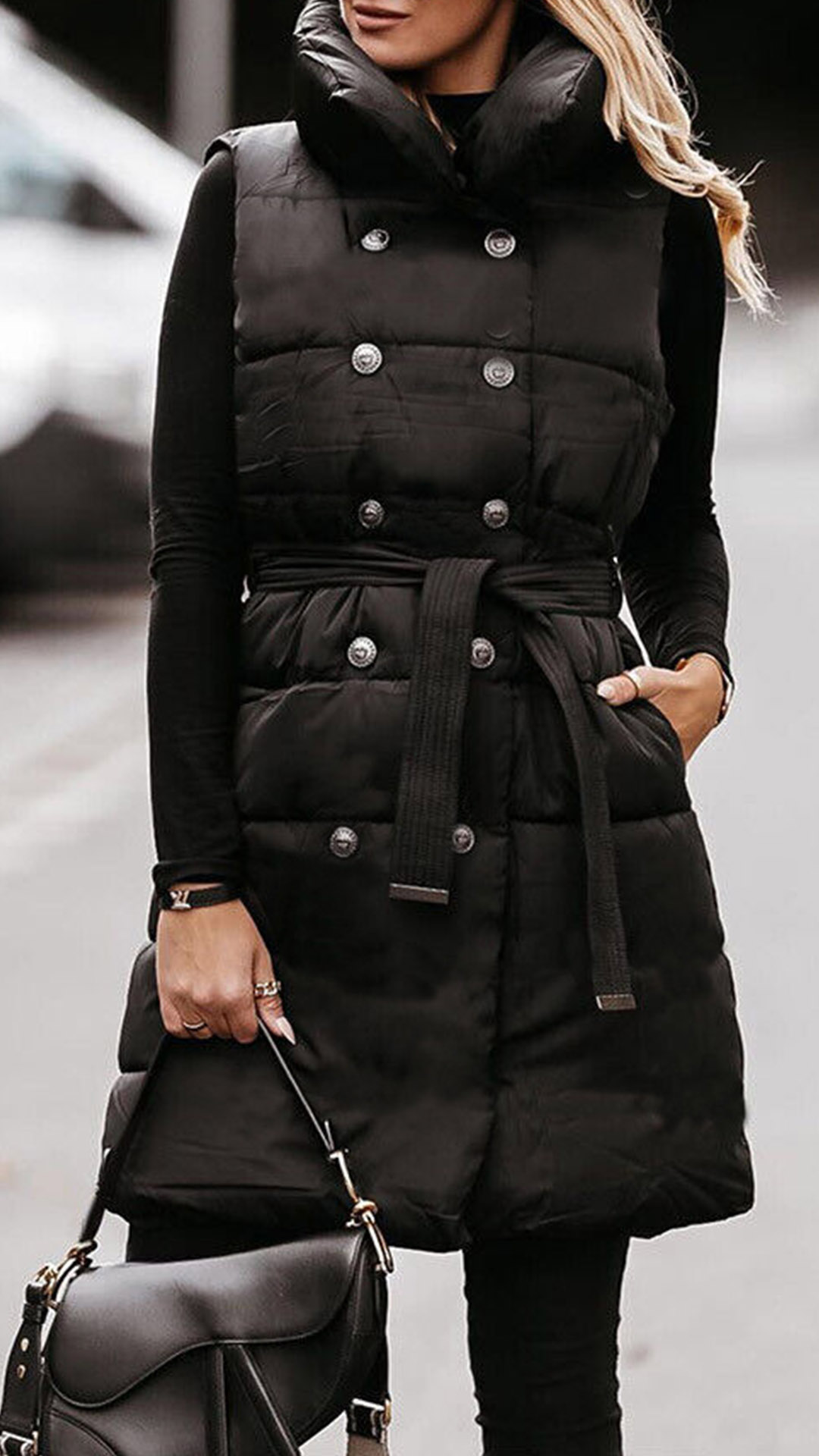 Gilet vintage à double boutonnage, sans manches, avec col montant à nouer