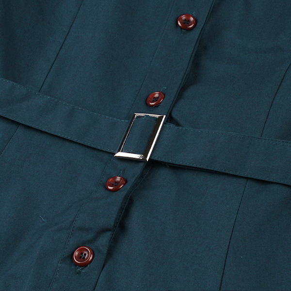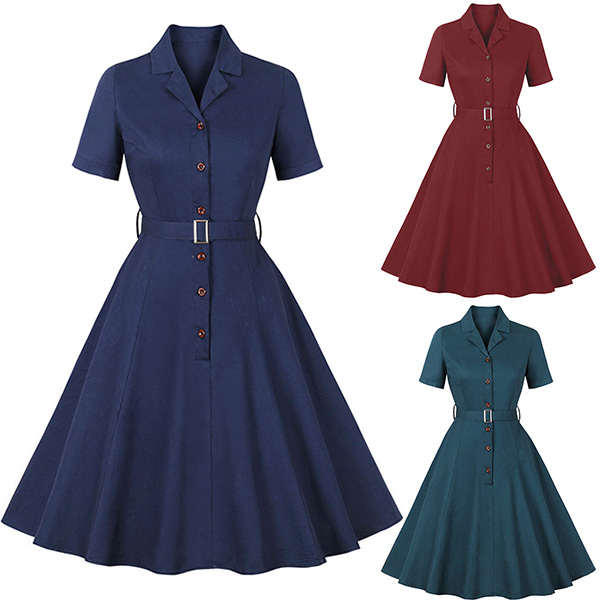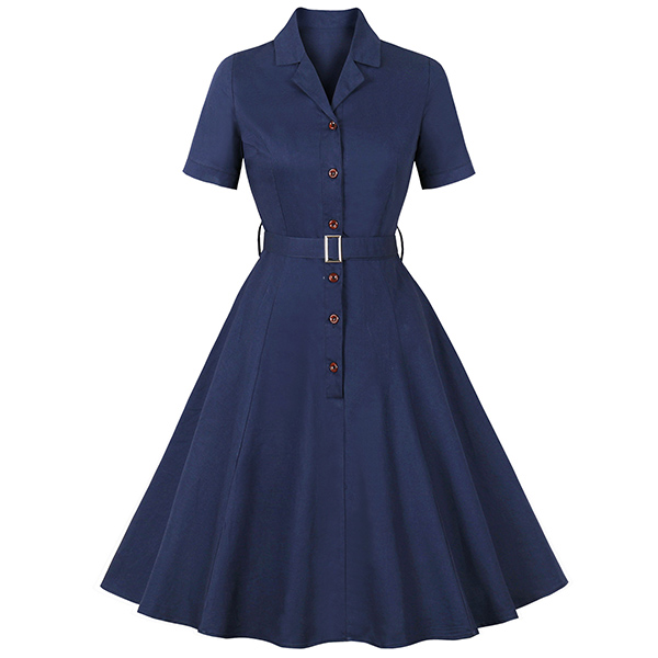 This elegant dress features a notch lapel neckline, short sleeves, front button detailing, and a belt for a vintage and elegant look. Multi-color avaible.