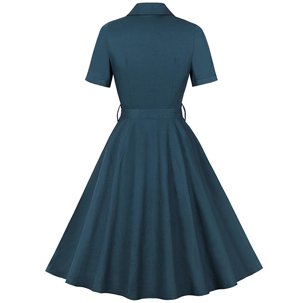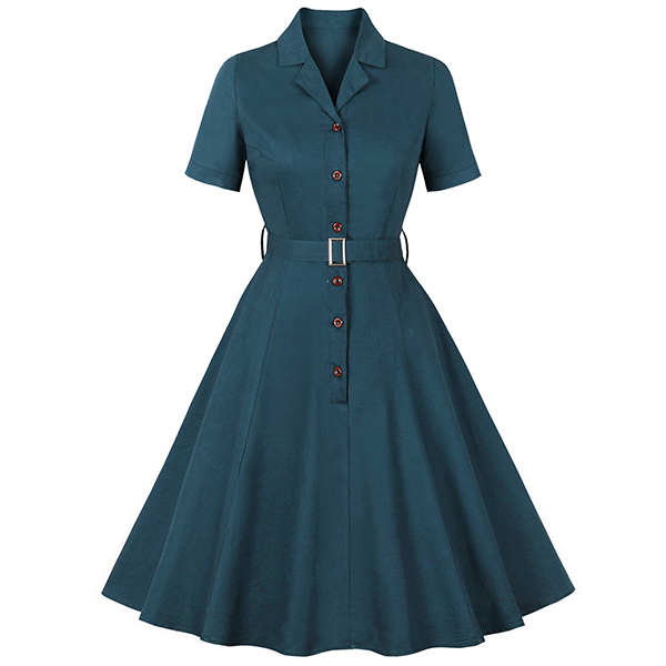 Vintage Elegant Notch Lapel Short Sleeve Front Button Dress with Belt