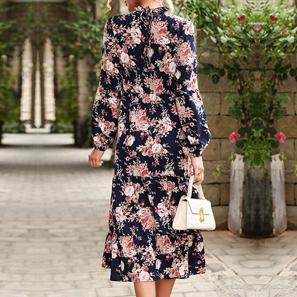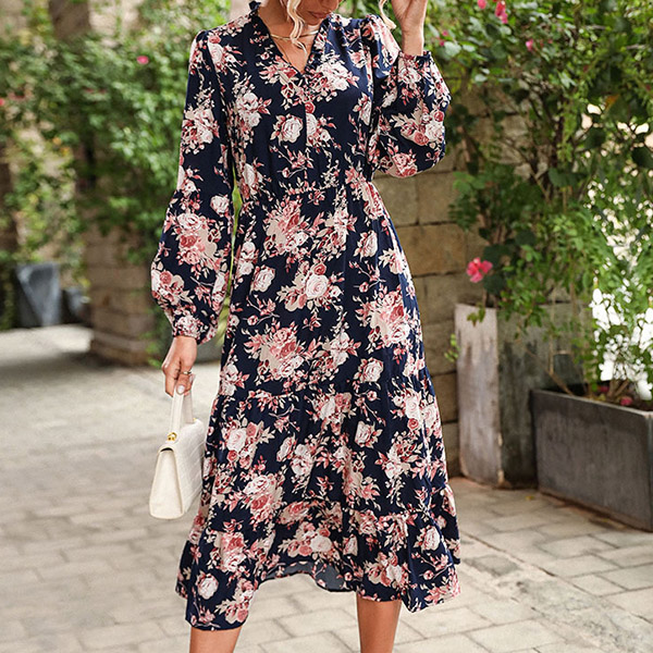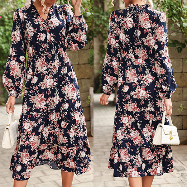 Vintage Fashion Floral Printed Long Sleeve Ruffled V-neck Dress