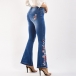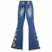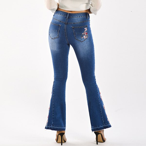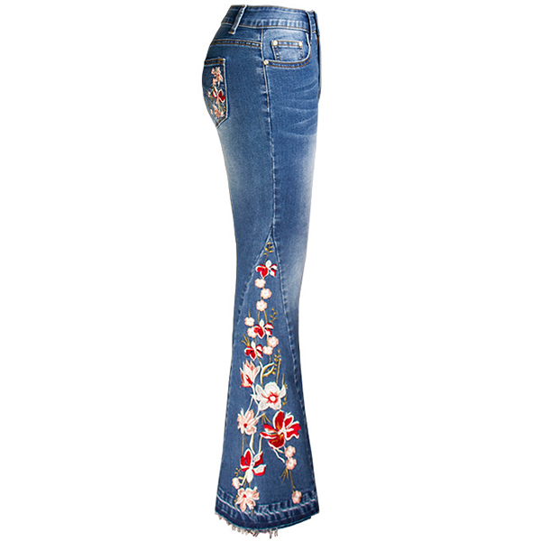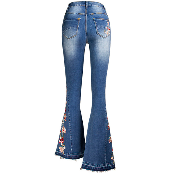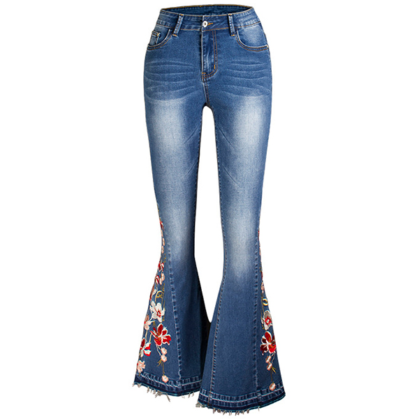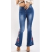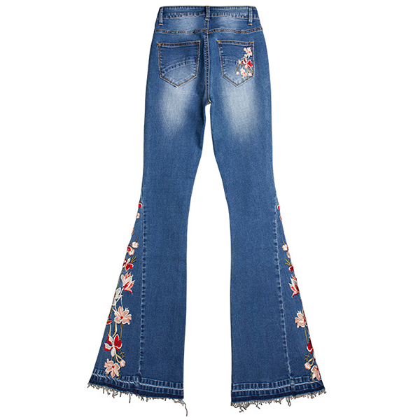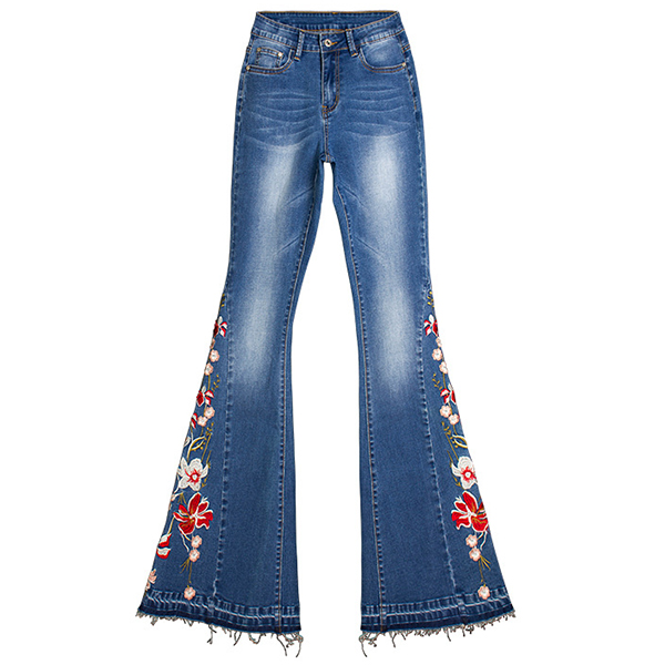 Vintage Floral Embroidery Frayed Hemline Flare Old-washed Denim Jeans