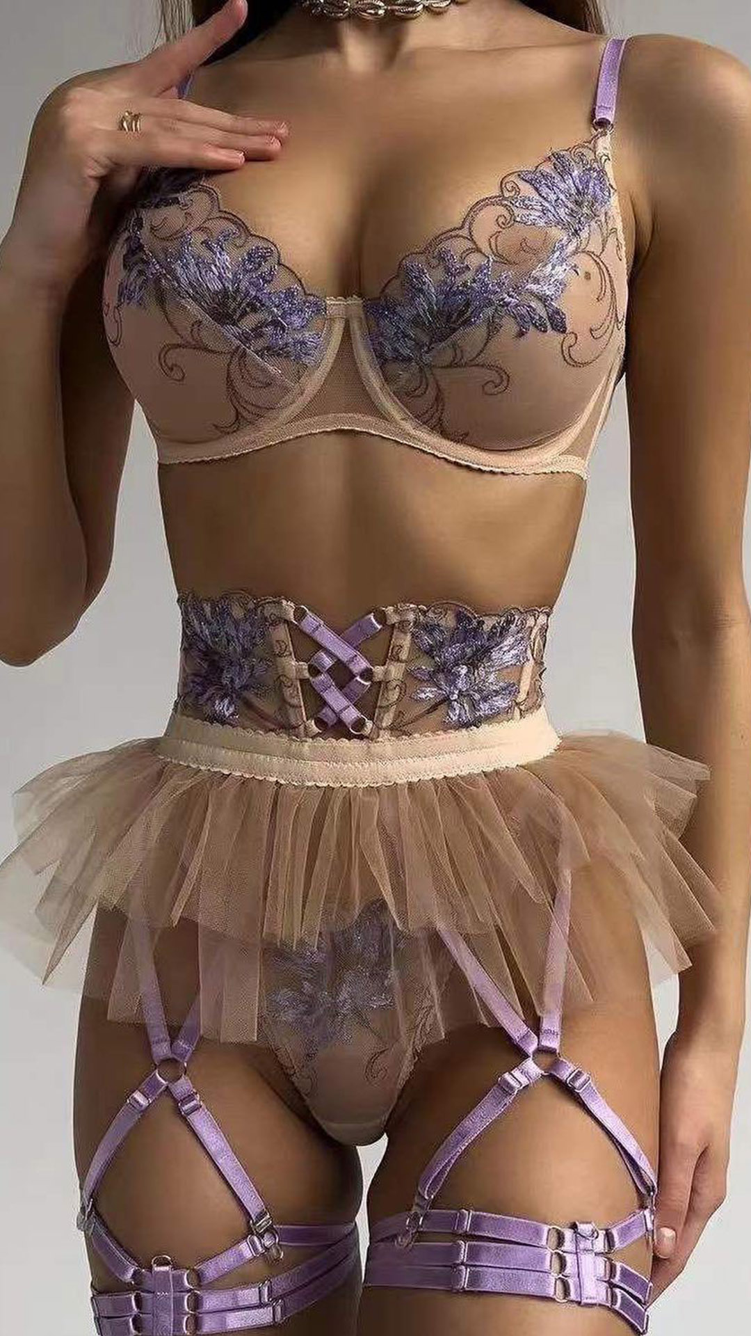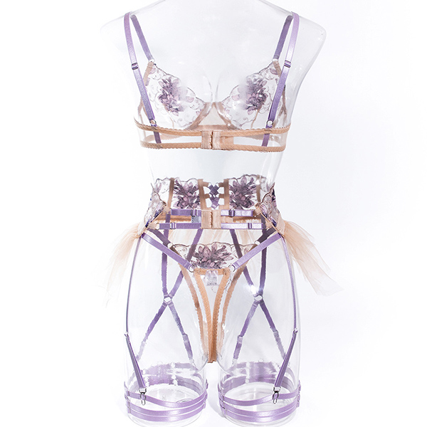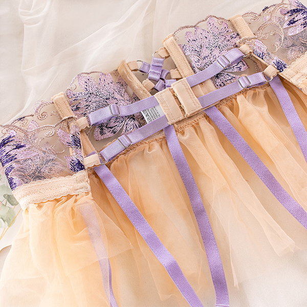 Vintage Floral Embroidery Ruffled Lace-up Four-piece Lingerie Set