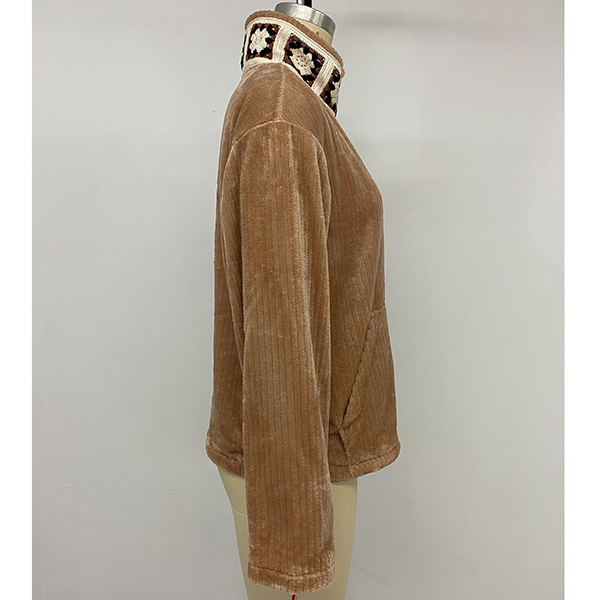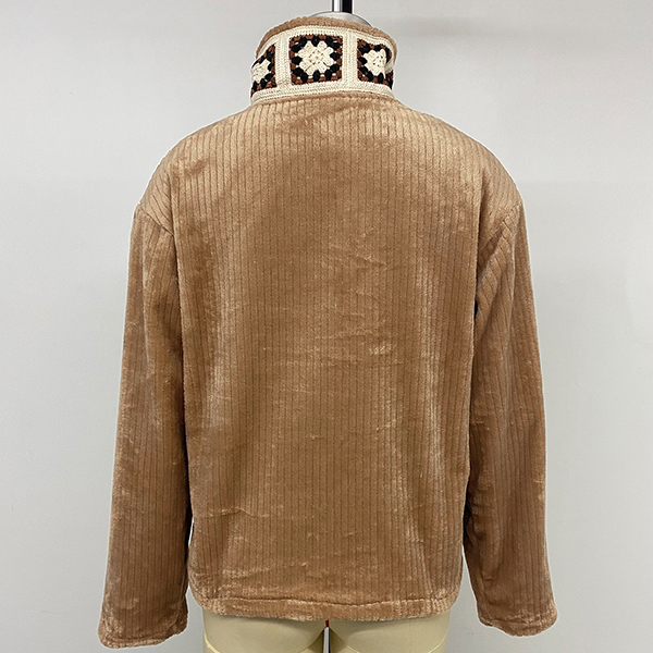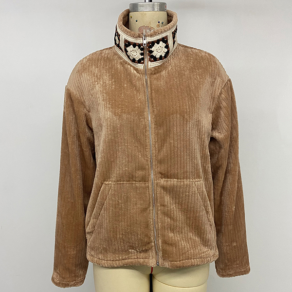 Vintage Floral Embroidery Stand Collar Long Sleeve Patch Pockets Plush Jacket