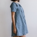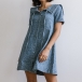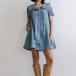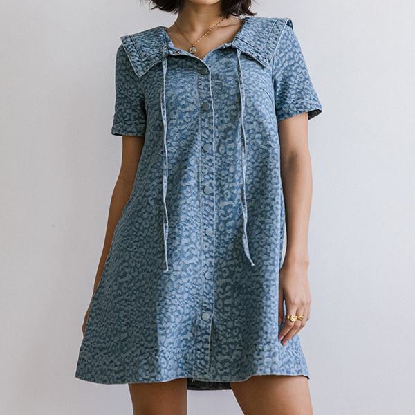 Vintage Floral Jacquard Drawstring Lapel Collar Short Sleeve Front Button Side Pockets Denim Dress