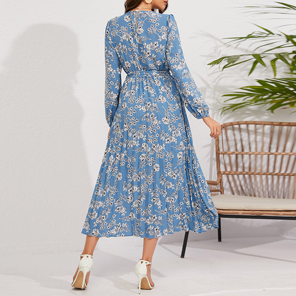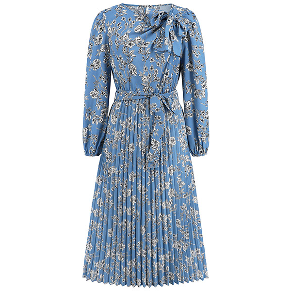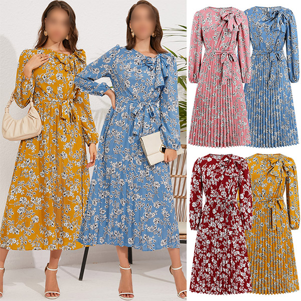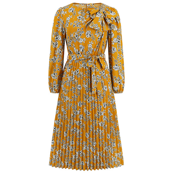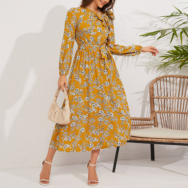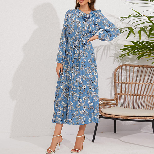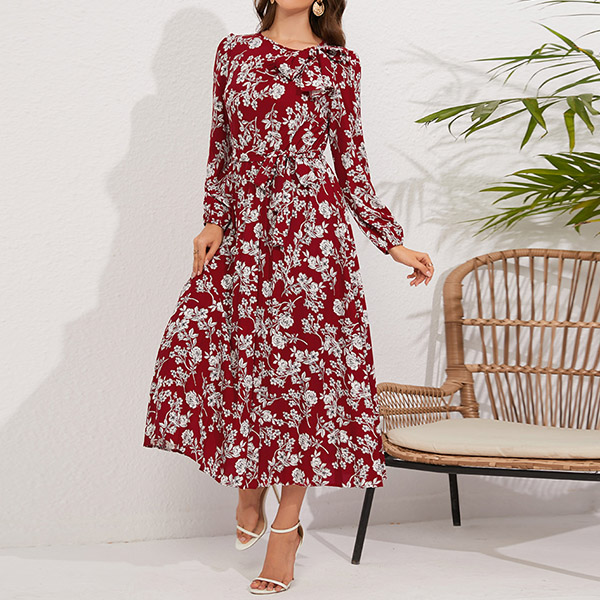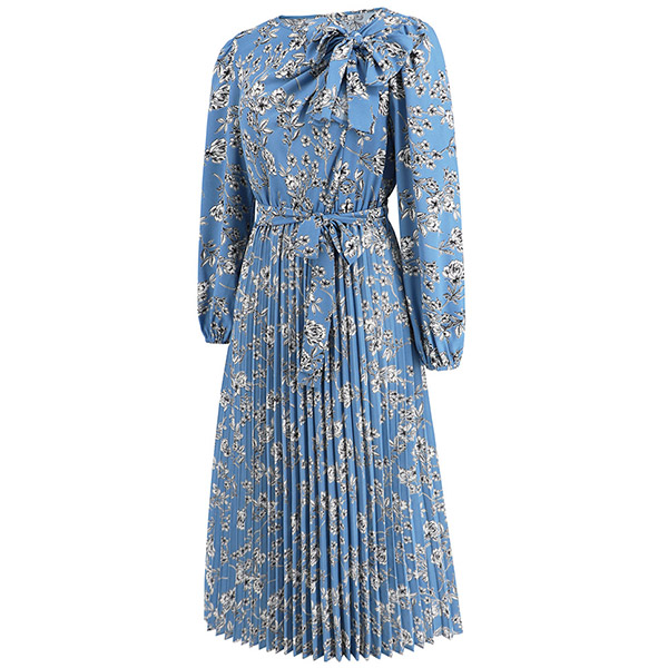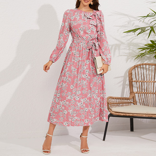 Vintage Floral Printed Bowknot Round Neck Long Sleeve Self-tie Pleated Dress