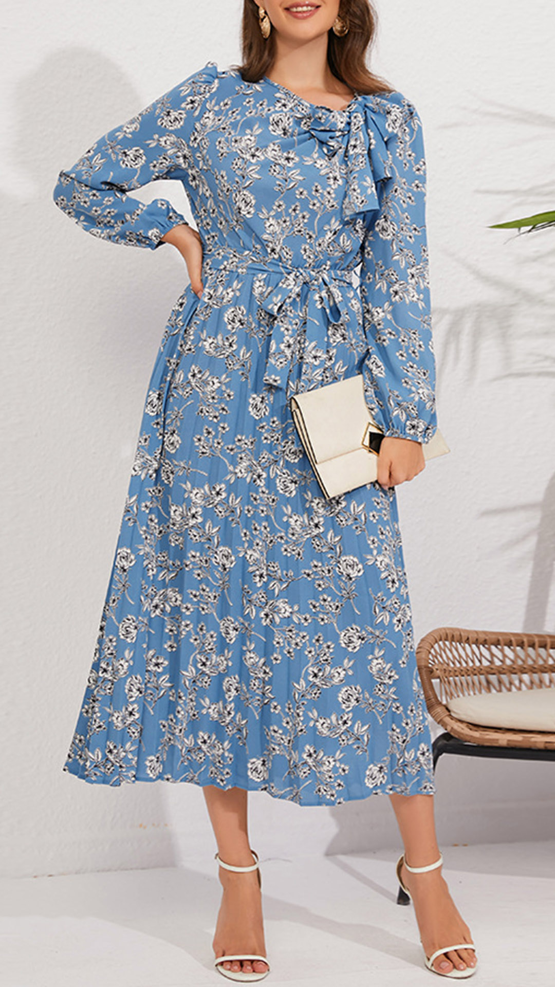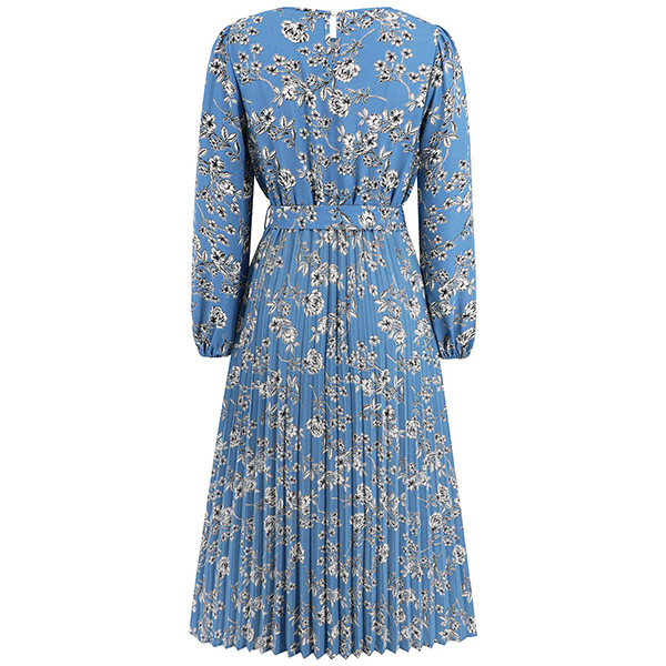 This stunning dress combines vintage charm with modern elegance. The floral print adds a touch of femininity and nostalgia, while the round neck and long sleeves provide a classic silhouette. The self-tie bowknot at the waist adds a stylish and adjustable detail, allowing you to accentuate your figure. The pleated design adds movement and flow to the dress, creating a graceful and flattering look. Made from high-quality materials, this dress offers both comfort and style.