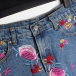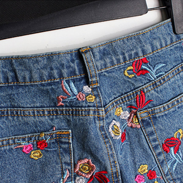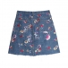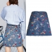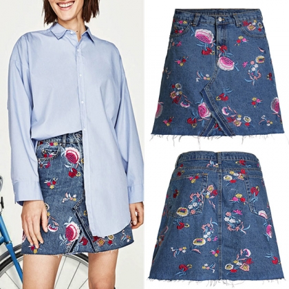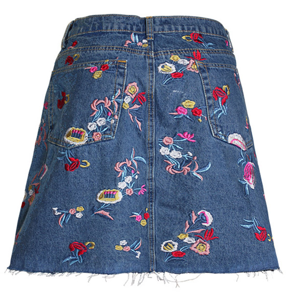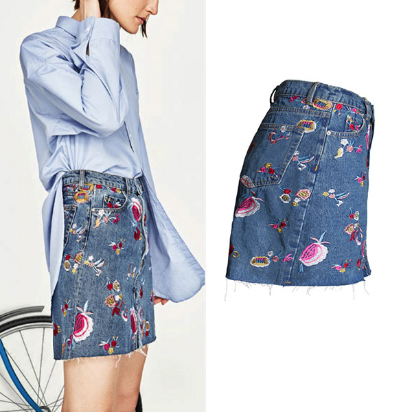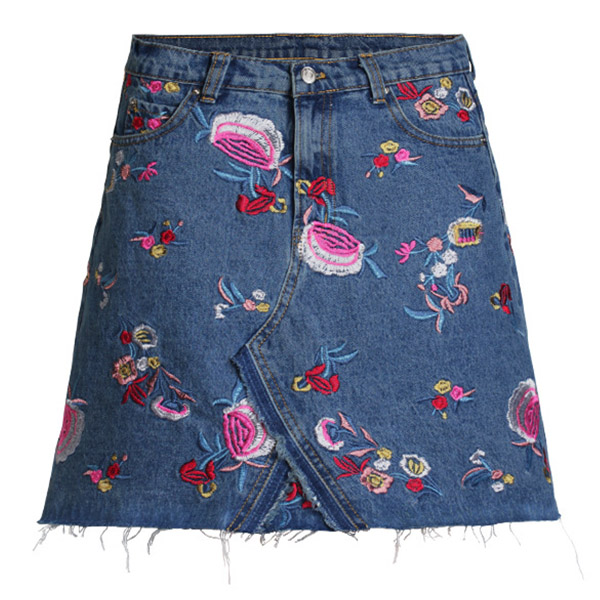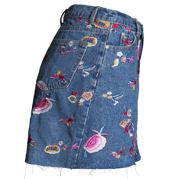 This skirt is made of a light denim material, has a high-rise waist, and is adorned with a beautiful floral print. The skirt also features frayed detailing at the bottom hem for a touch of whimsy! Wanna have one?