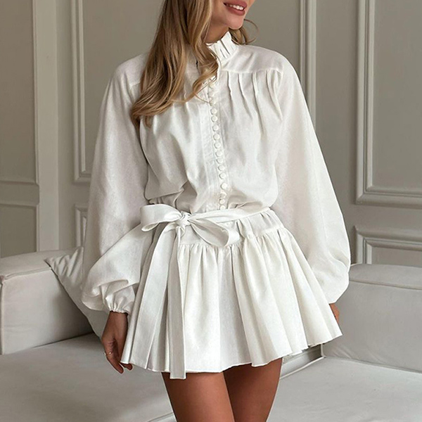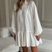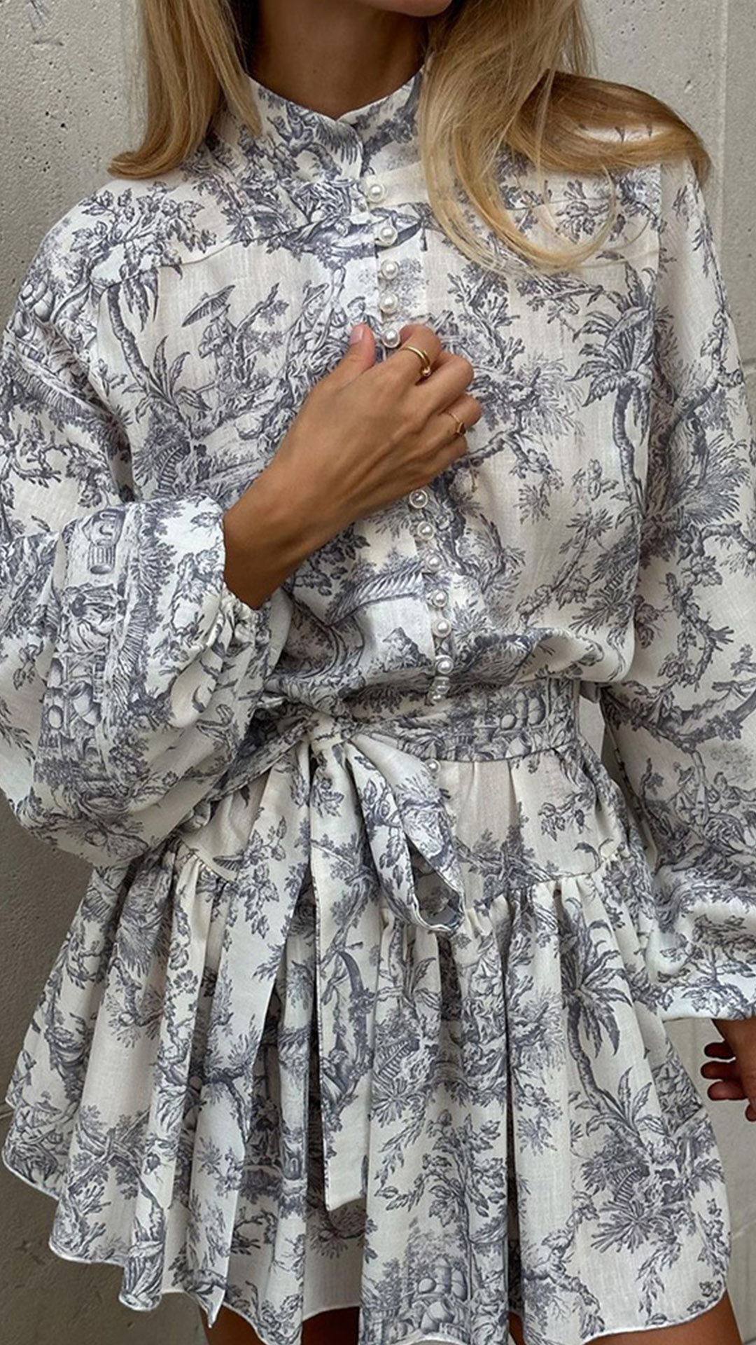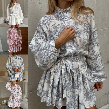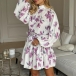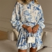 Vintage Floral Printed Front Button Long Sleeve Self-tie Ruffle Hemline Mini Dress