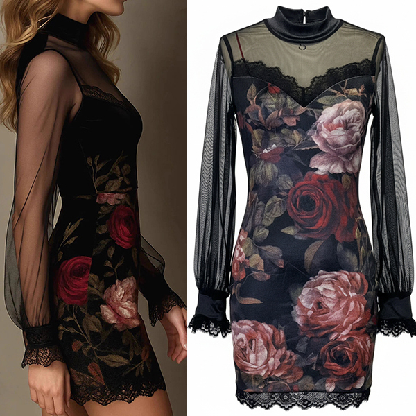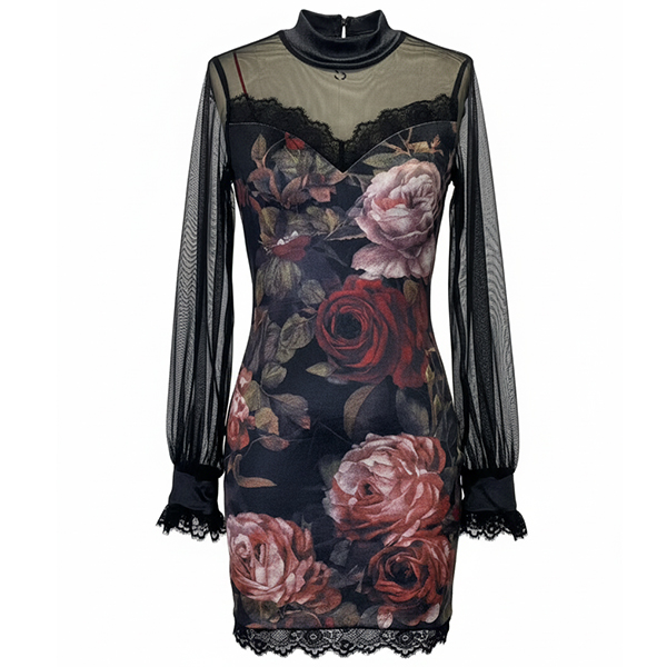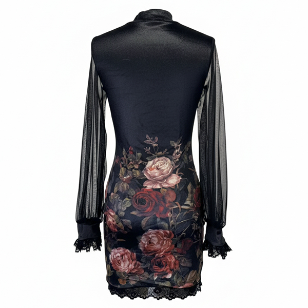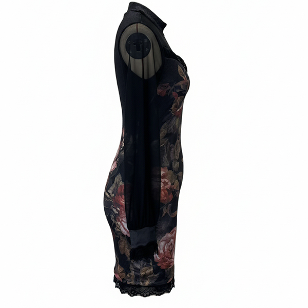 Vintage Floral Printed Gauze Spliced Long Sleeve Lace Hemline Bodycon Dress