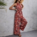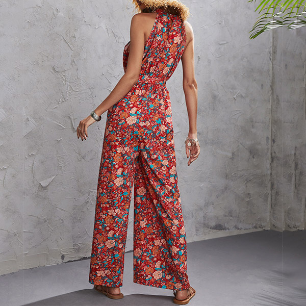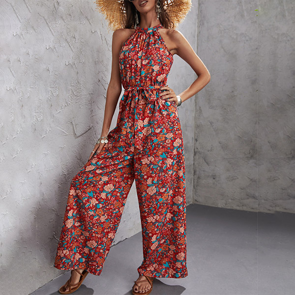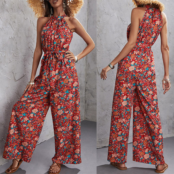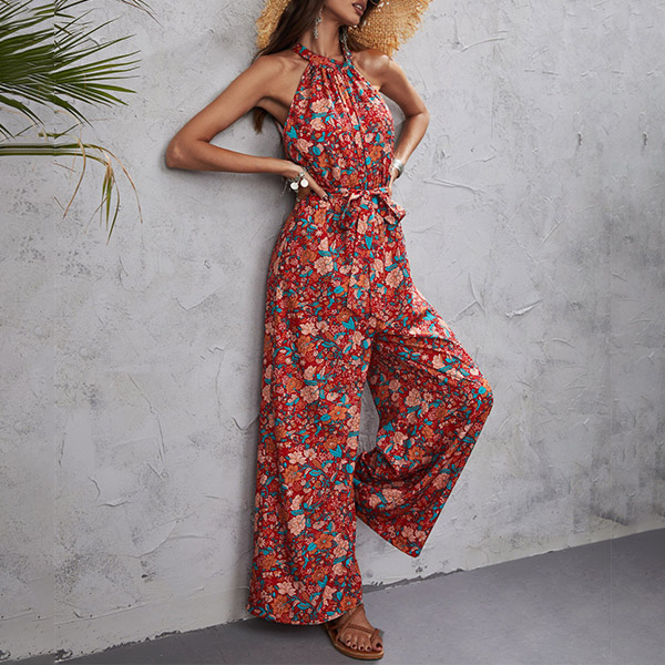 Vintage Floral Printed Halter Wide-leg Jumpsuit