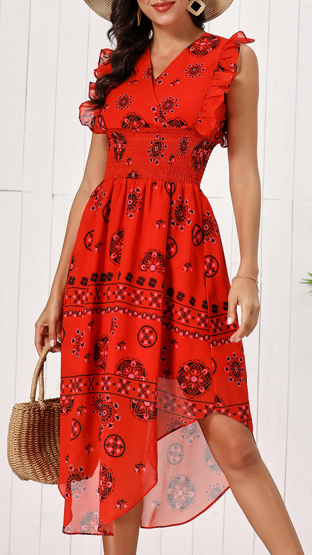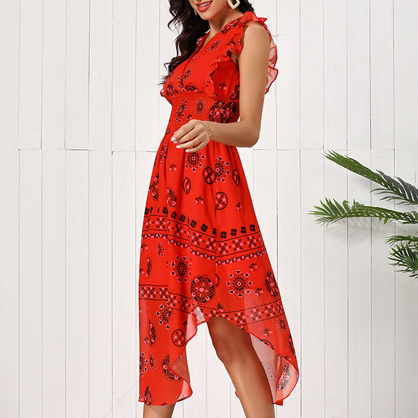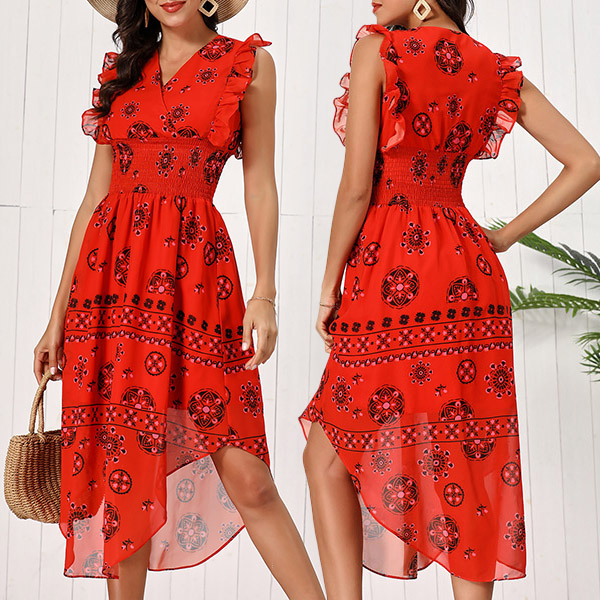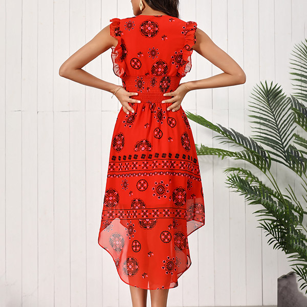 Vintage Floral Printed Ruffle Sleeveless V-neck Irregular Hemline Smocked Dress