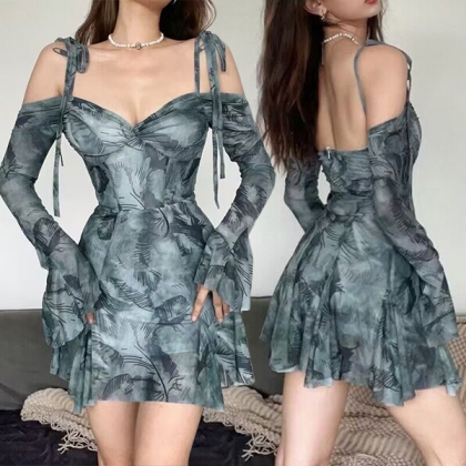 Vintage Floral Printed Sweetheart Neckline One-shoulder Trumpet Long Sleeve Self-tie Slip Dress