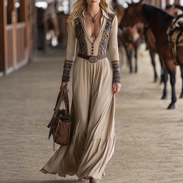Vintage Floral Printed V-neck Long Sleeve Maxi Dress