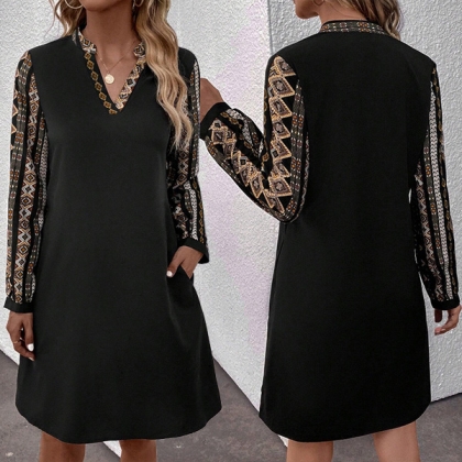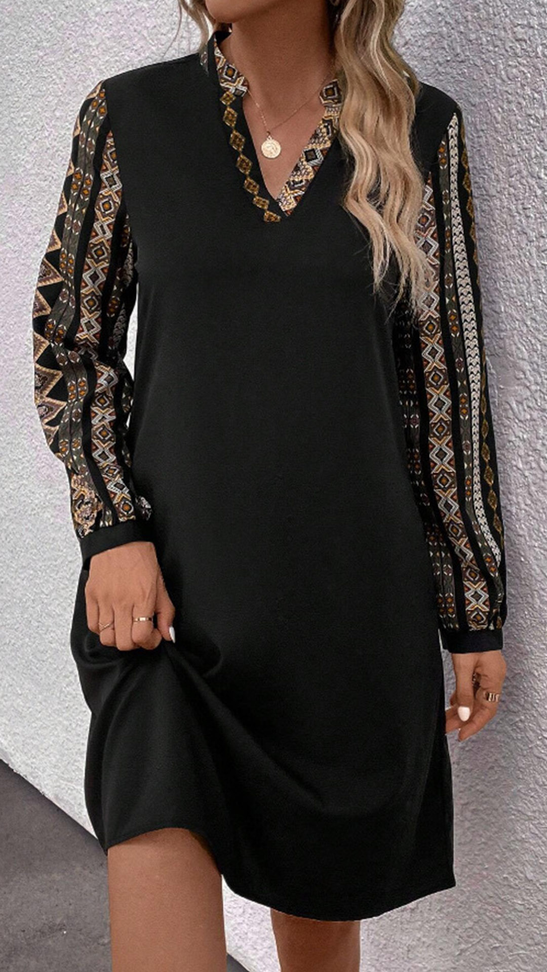 How about this dress? The vintage floral print along the V-neck and long sleeve adds a romantic and feminine element, making it perfect for various occasions. Pair it with ankle boots or sandals for a casual and effortless ensemble.