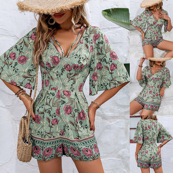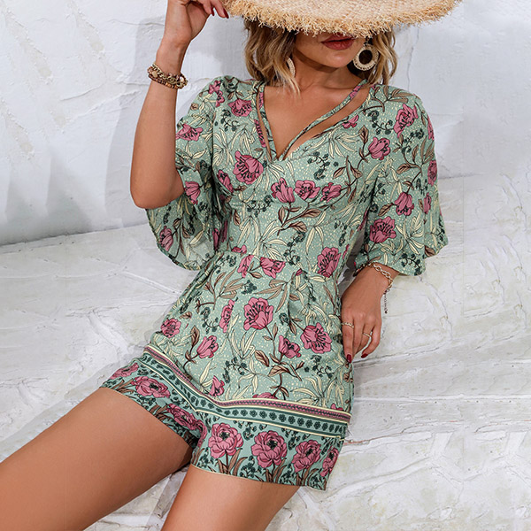 Vintage Floral Printed V-neck Trumpet Short Sleeve Romper