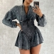 Vintage Half-zipper V-neck Long Sleeve Smocked Cinch Waist Old-washed Denim Romper