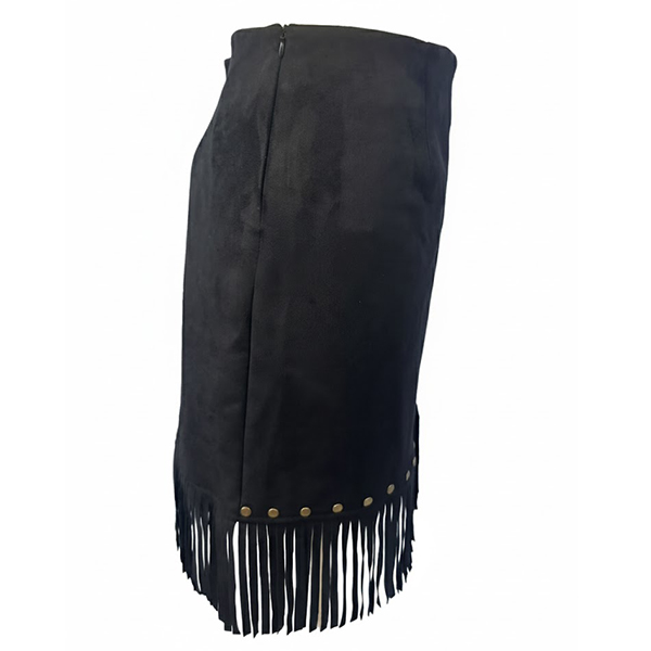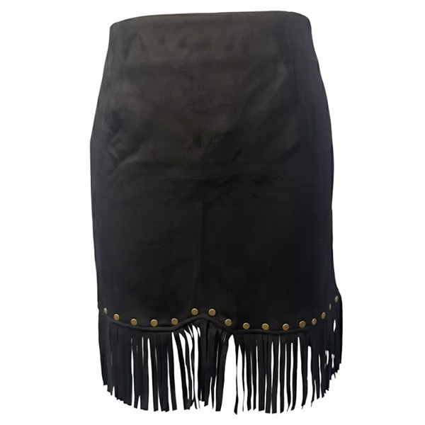 This statement skirt features classic high-rise styling with edgy rivet embellishments and dynamic tassel detailing for vintage rock sophistication. Pair with band tees and combat boots for authentic vintage rock appeal.